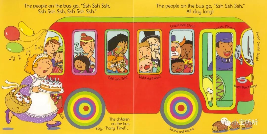 在学唱儿歌过程中,在绘本中孩子们不但可以学到汽车轮子(wheels),雨刷(wipers),喇叭(horn),司机(driver),车票(ticket)等常用语,同时还能拓展常见的拟声词如:swish, beep,wah,ssh等!