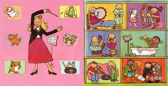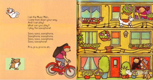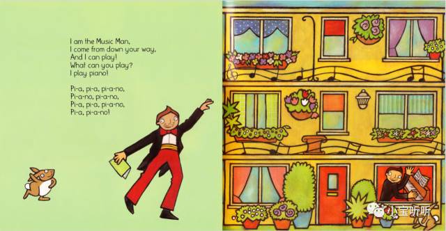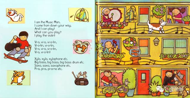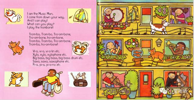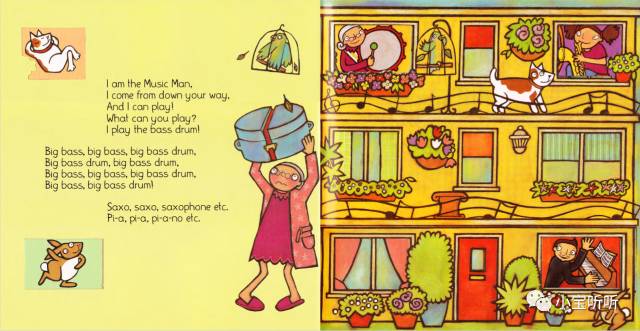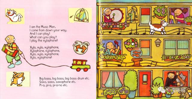 绘本的音频韵律强,节奏轻快,句型重复率高,适合给小宝宝磨耳朵,也适合给大宝宝来了解乐器知识,我们一起来学一学吧。