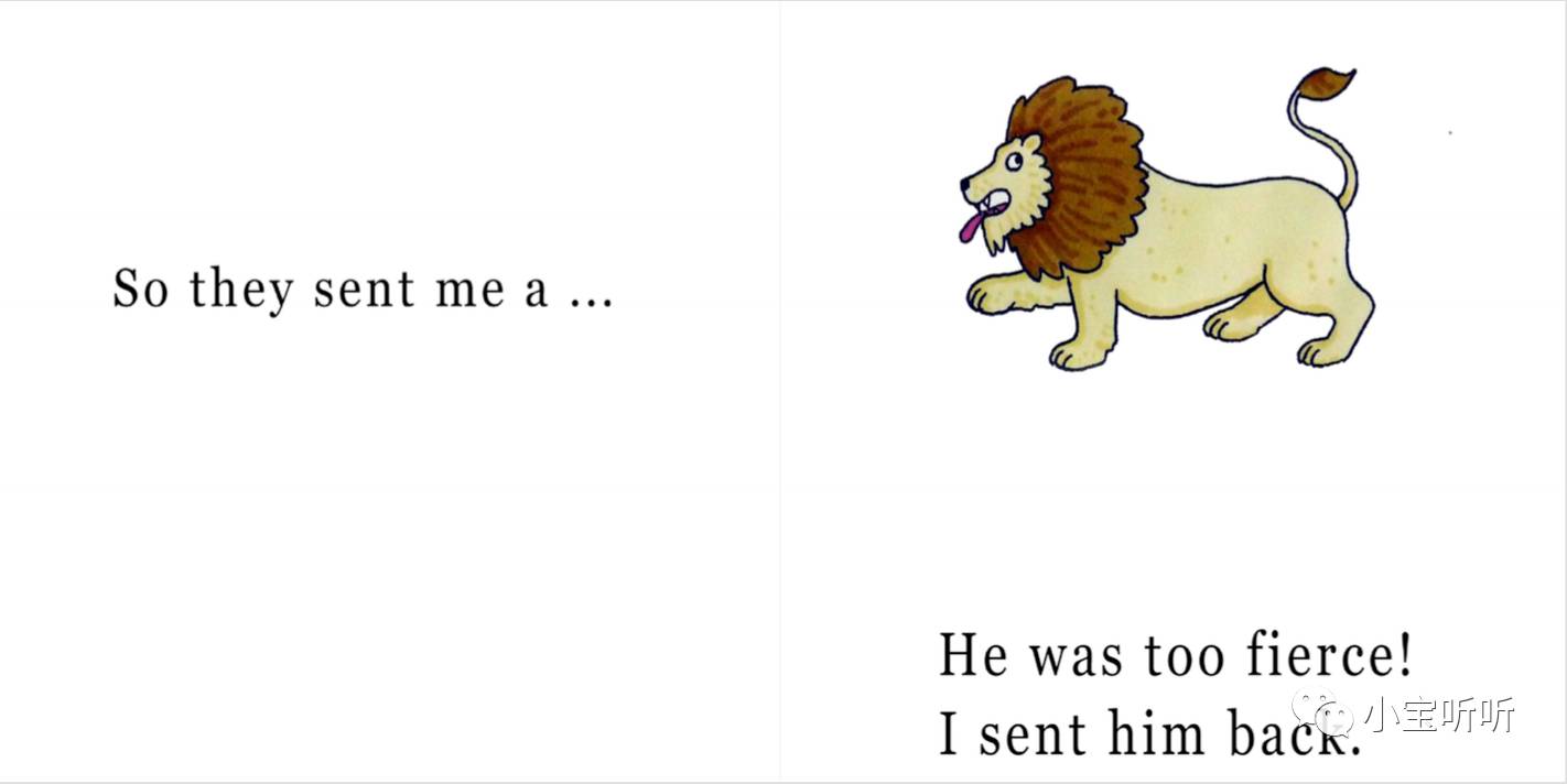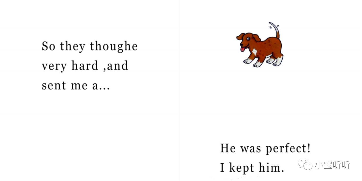 一个小朋友想要养宠物,于是写信给动物园希望能养一只宠物。没想到,动物园寄来的各式各样的动物,不是太大、太高,就是太恐怖或太调皮,就是没有他想要的,直到最后,动物园寄来一只狗,小朋友终于找到刚刚好适合他的宠物。