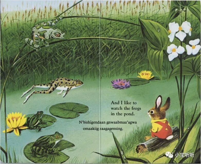 1、生活拓展:带宝宝到大自然中寻找书中的动植物,让孩子有更直观的了解,公园、动物园都是好地方,欣赏美丽的花朵、在池塘边看青蛙蹦蹦跳跳、躺在草地上看天上的小鸟儿飞……小兔子就是我们自己哦。