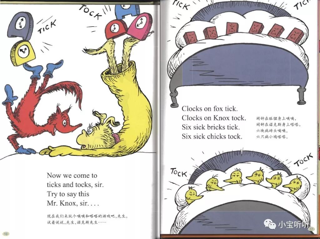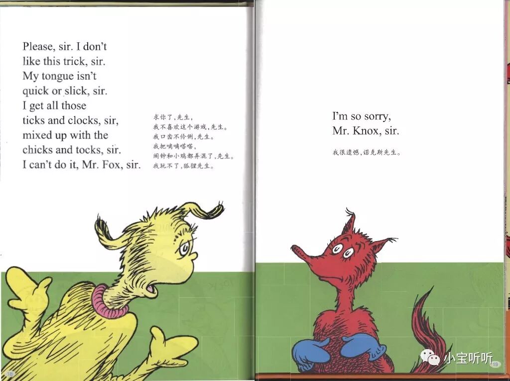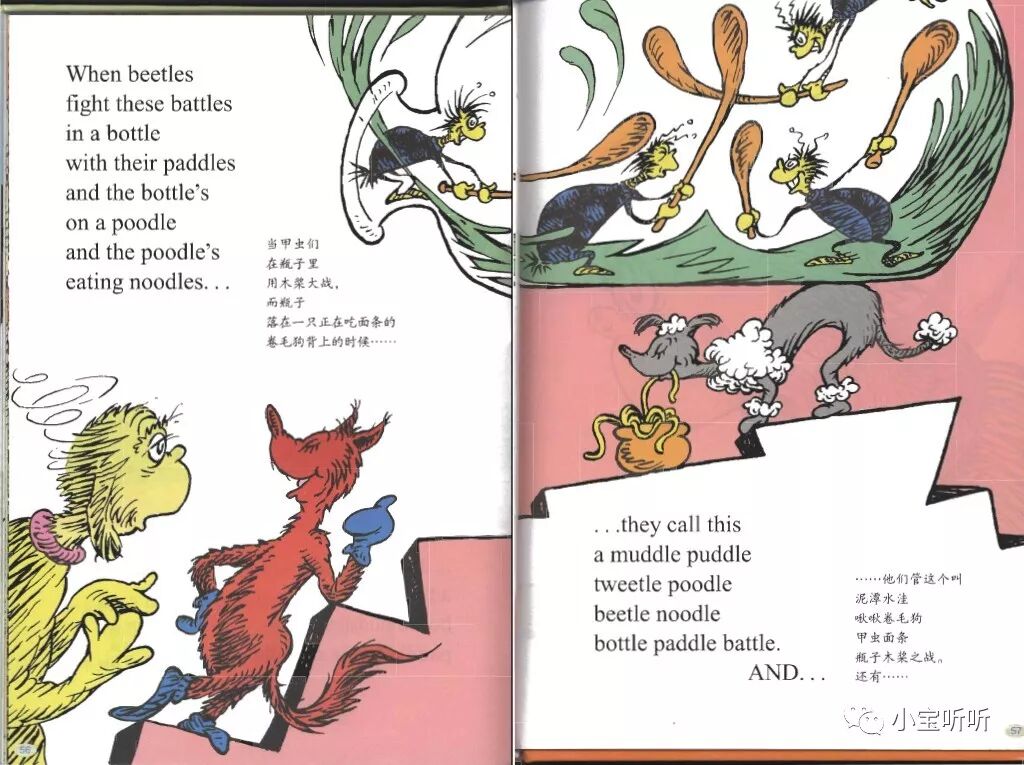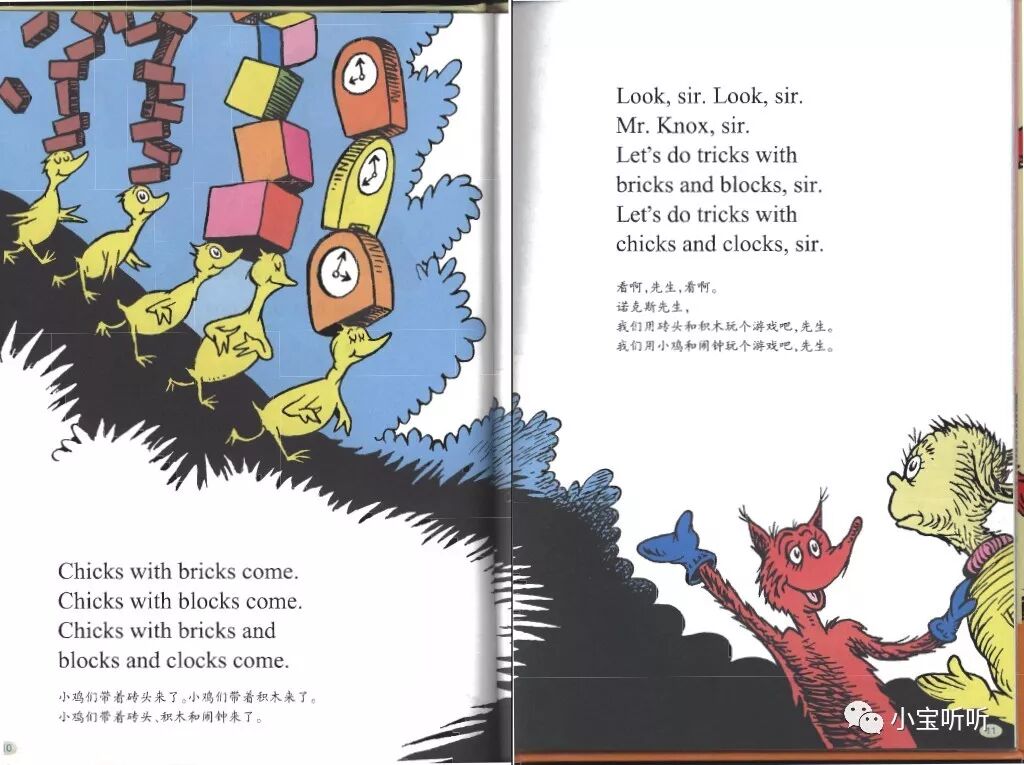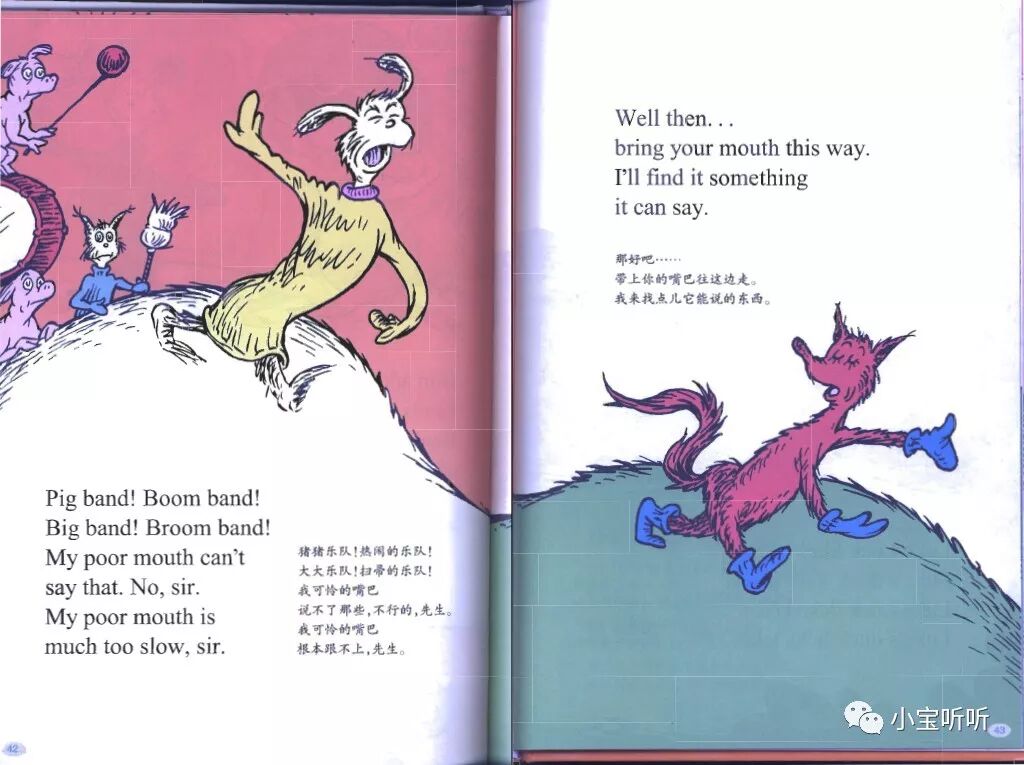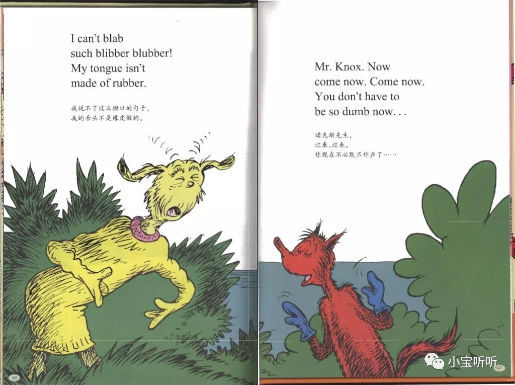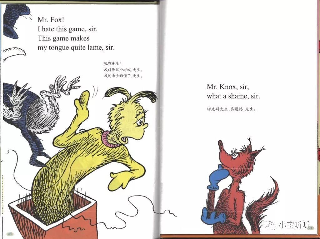 当小朋友们读完这些滑稽的故事后才发现,其实不光Knox的舌头抽筋了,小朋友们的舌头也快抽筋了。原来,苏斯博士运用了极富韵律的语言,将故事变成了绕口令,锻炼小朋友说话的能力。
