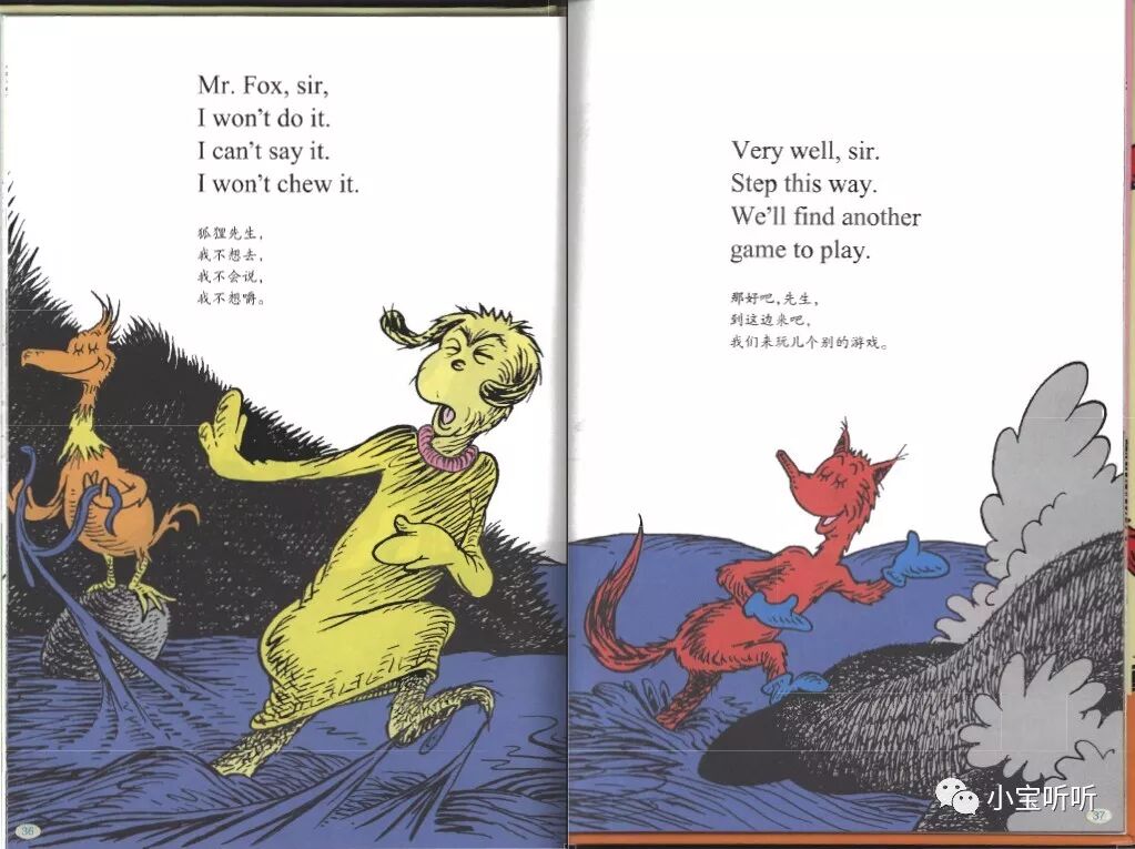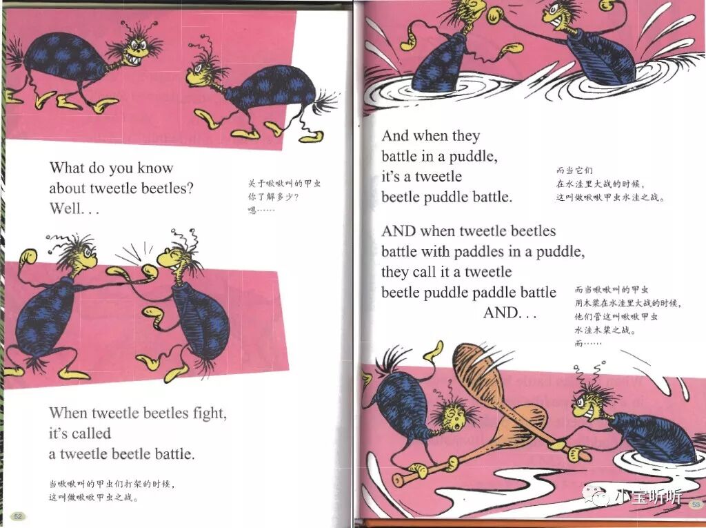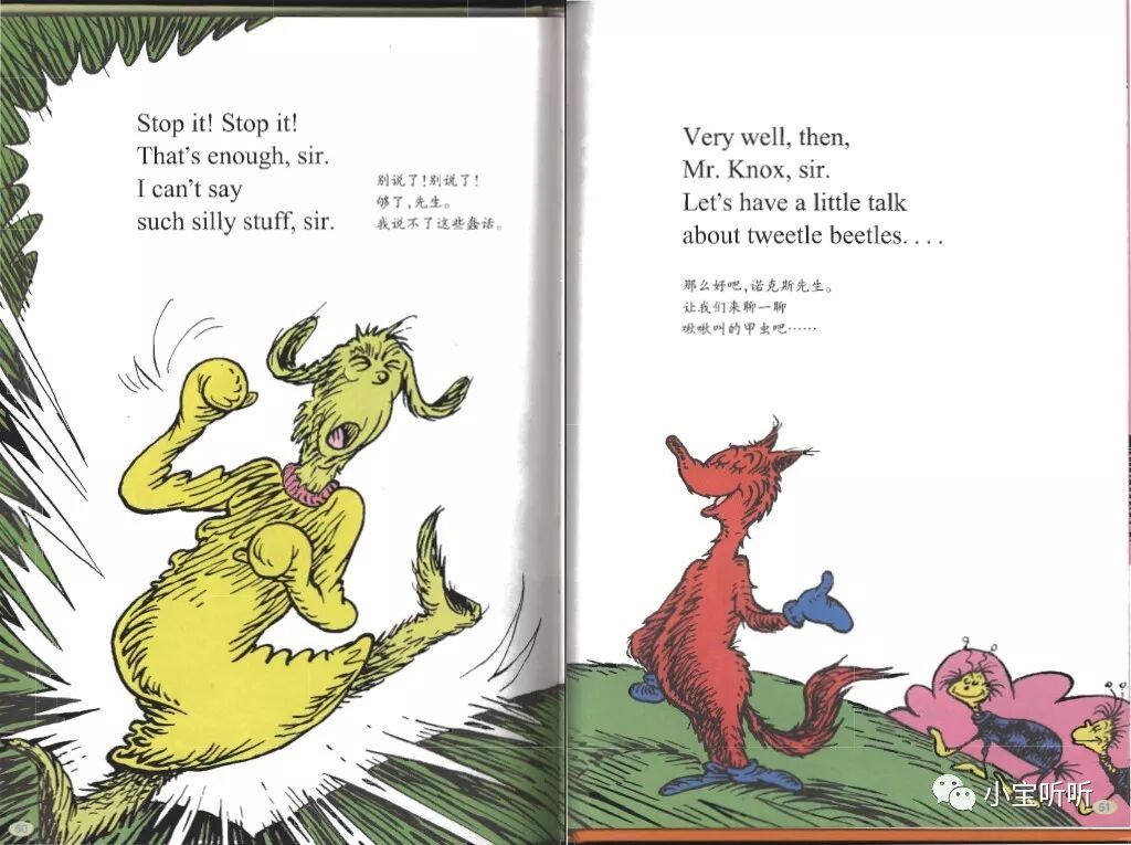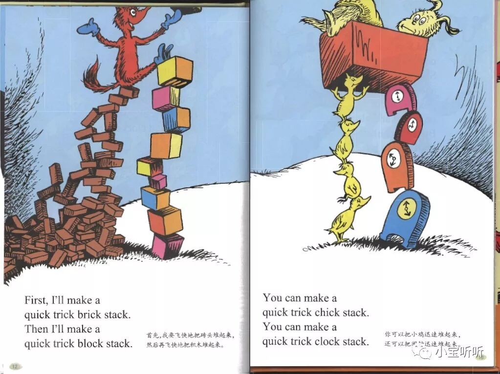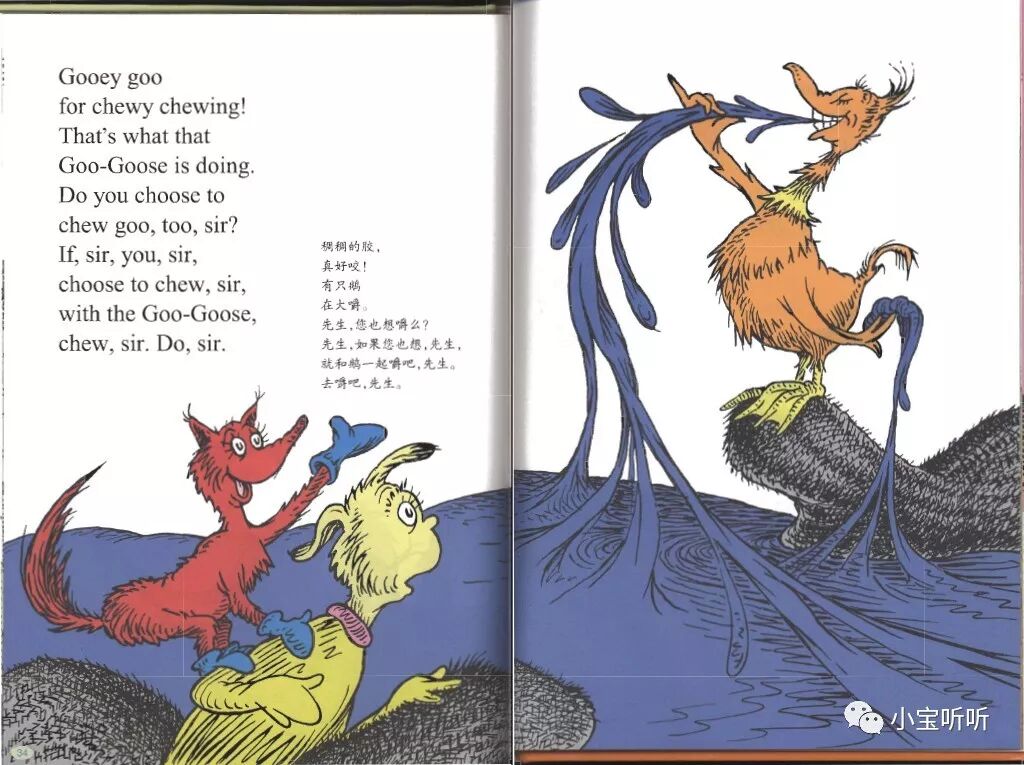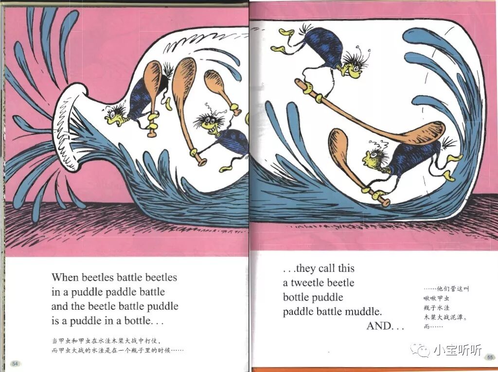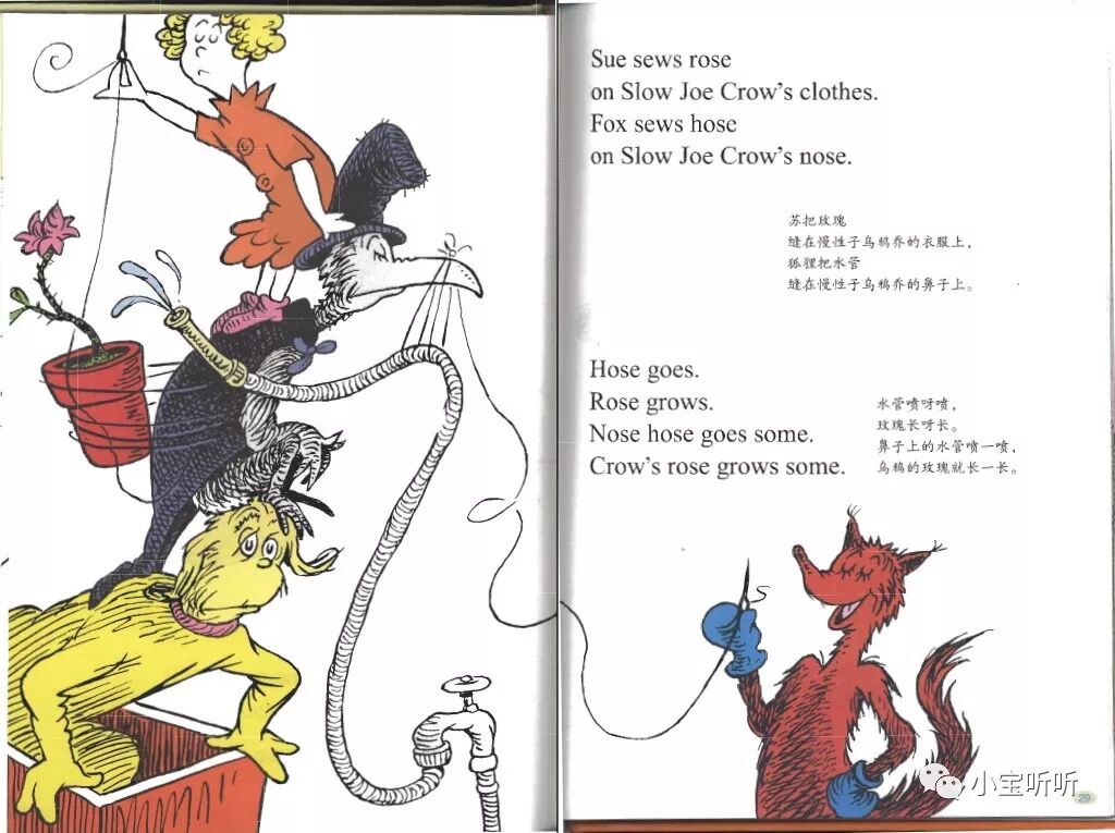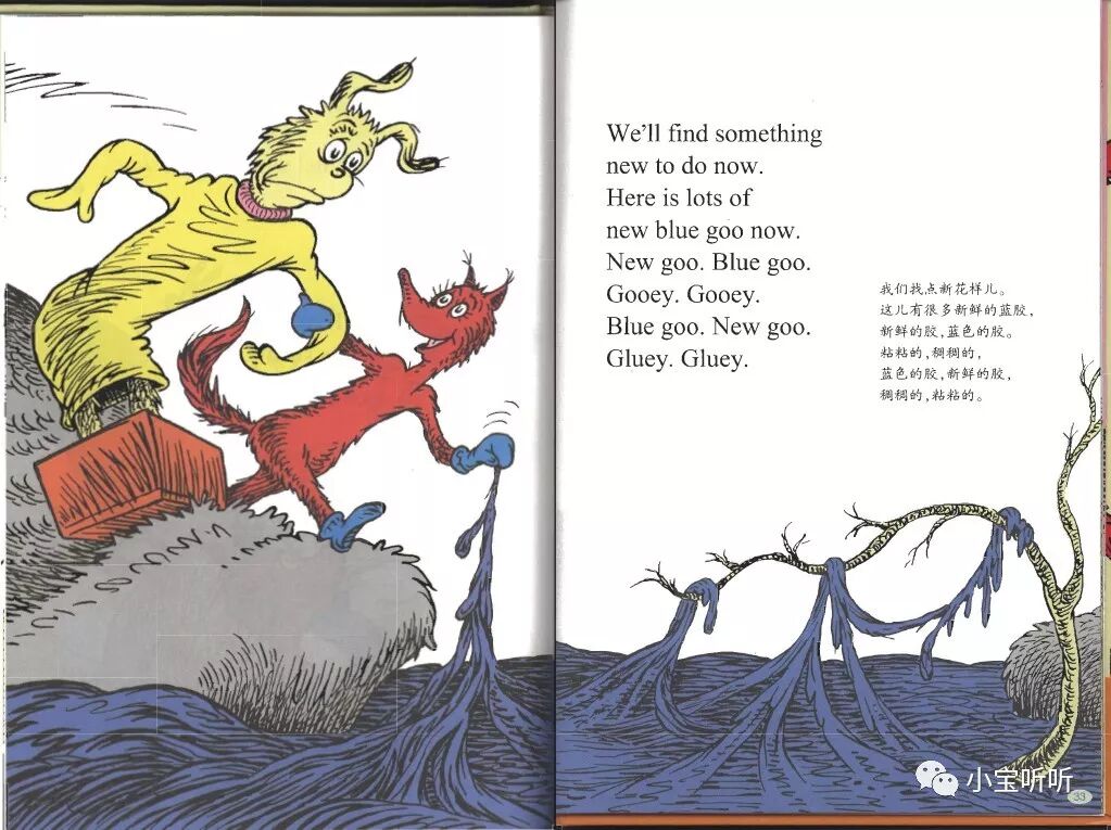 当小朋友们读完这些滑稽的故事后才发现,其实不光Knox的舌头抽筋了,小朋友们的舌头也快抽筋了。原来,苏斯博士运用了极富韵律的语言,将故事变成了绕口令,锻炼小朋友说话的能力。