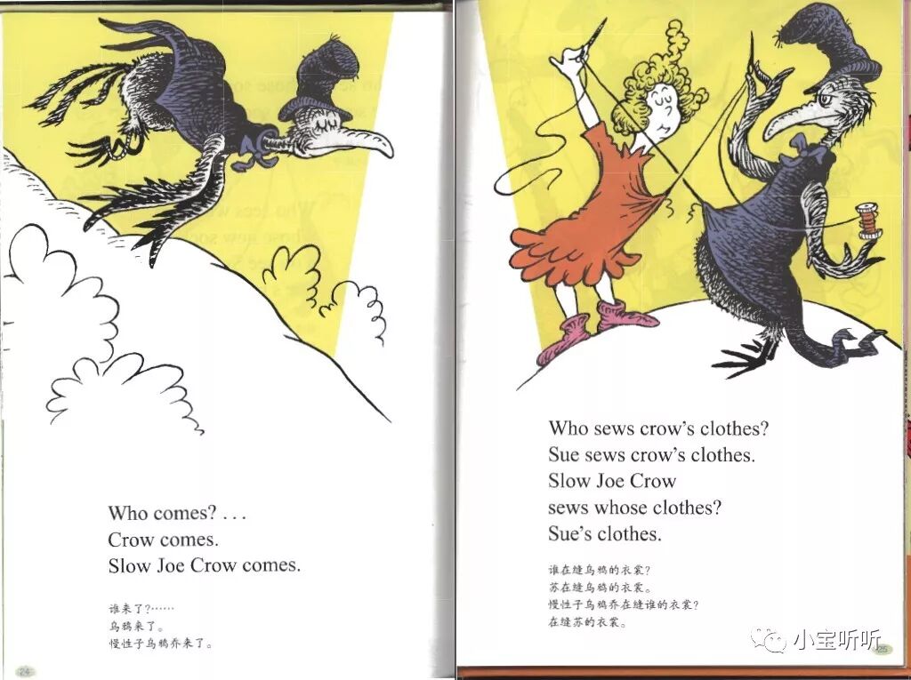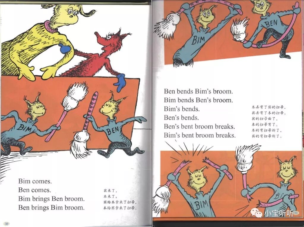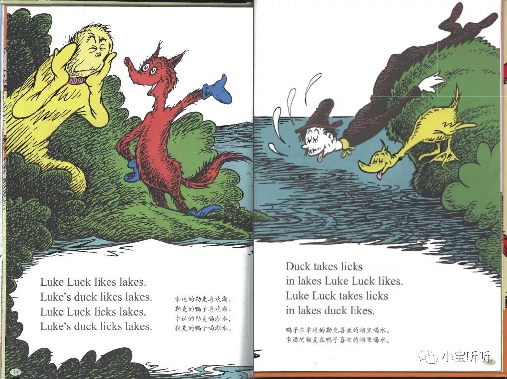 比起那些进阶型英文读物的枯燥无味,苏斯博士的作品的确首先是能激发孩子的兴趣;其次是故事更是富有想象力,情节引人入胜的、风趣幽默;最后也是最重要的是,从单词开始,组成韵味十足的句子,不断重复并增加难度。