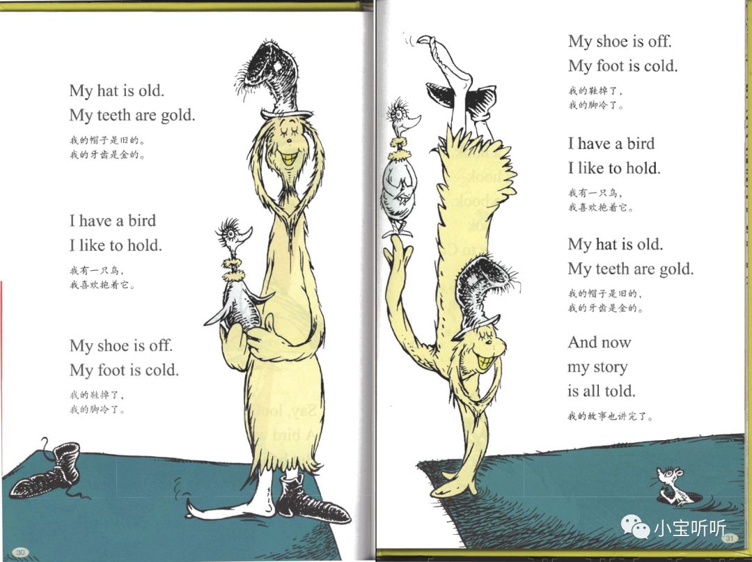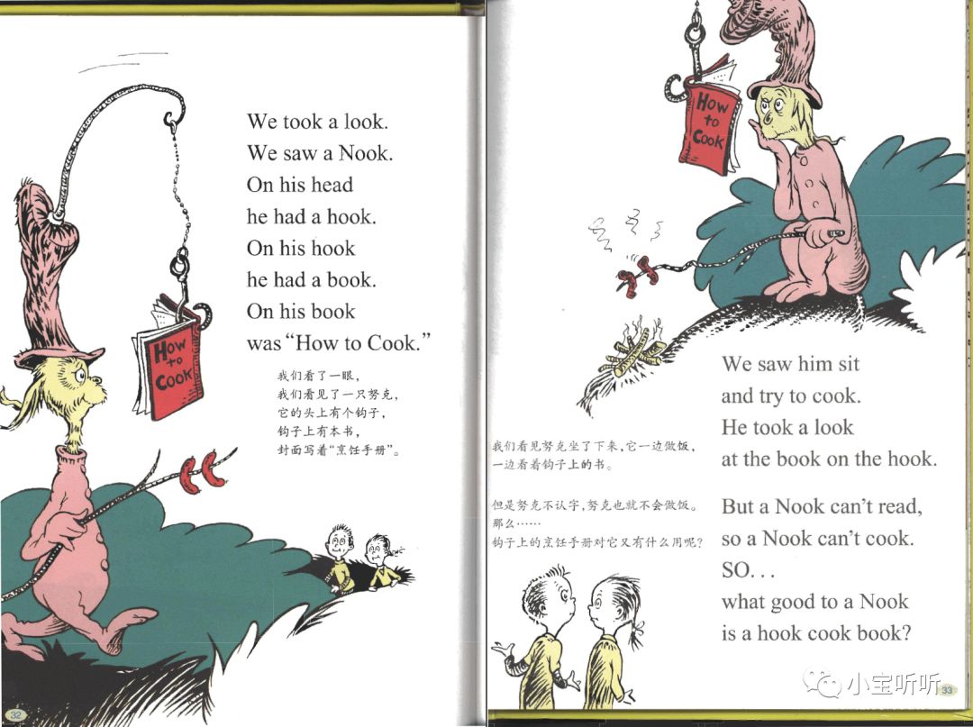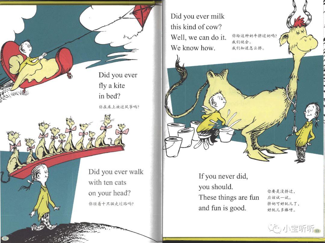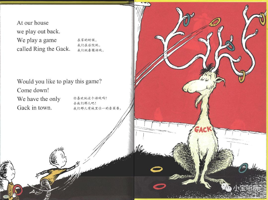 这本绘本一贯延续了苏斯博士的作风,押韵词汇出奇得多,而且故事幽默,构想奇特,词汇句子精磨,,搞怪无厘头,让孩子大爱呀。
