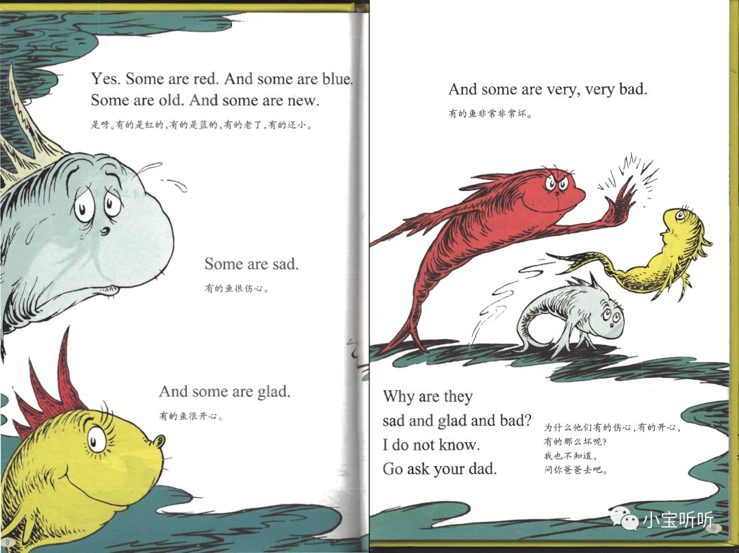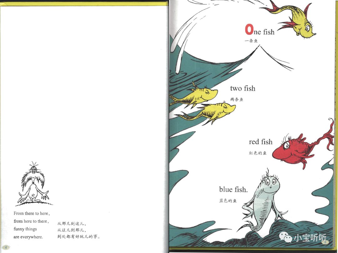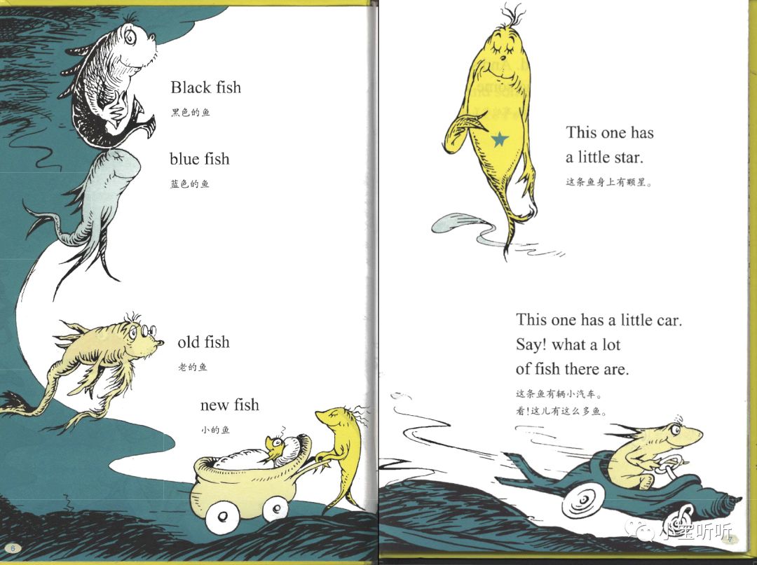 《一条鱼,两条鱼,红的鱼,蓝的鱼》是苏斯博士专为可以独立阅读的儿童编写的一本桥梁读物。
