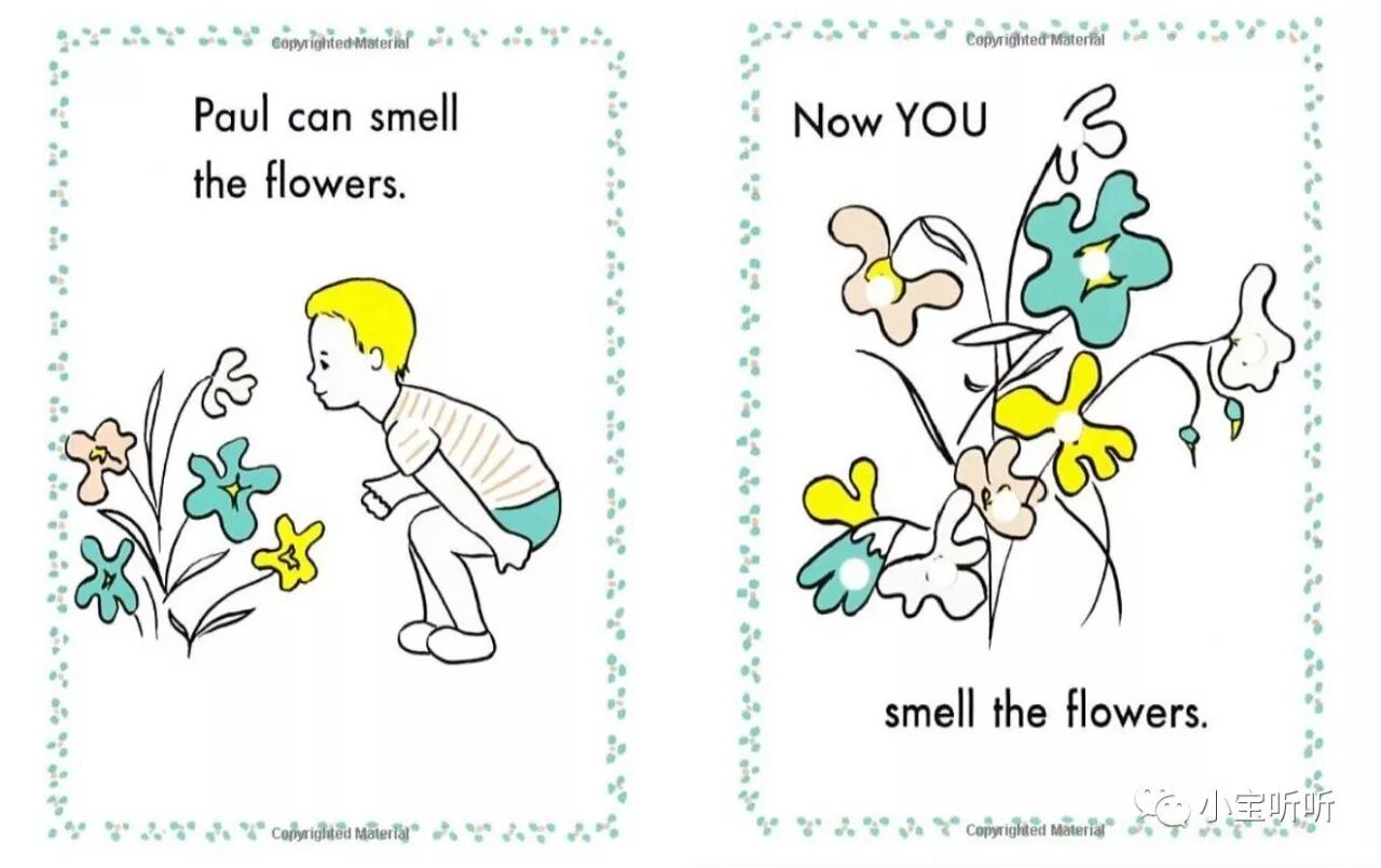 绘本简介:这本书从视觉、嗅觉、触觉等多方面来刺激宝宝的感官,激发宝宝对绘本和英语的兴趣,通过“玩”的方式,帮助孩子养成良好习惯,是亲子互动、亲子游戏的最佳启蒙童书哦。
