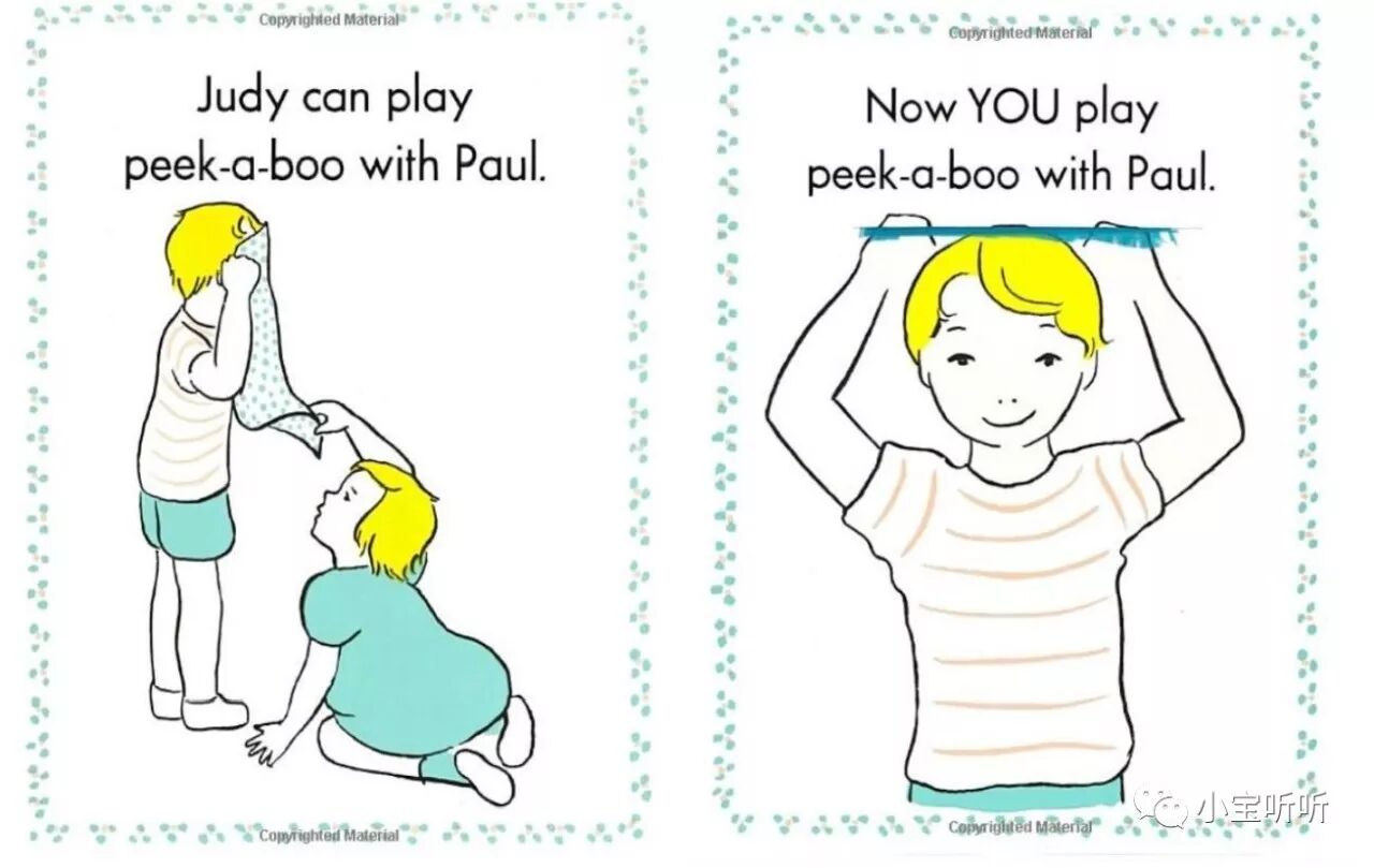 2、peek a boo,这个必须要学会,还记得那首经典的peek a boo儿歌嘛。I see you,I found you,这些单词要手到擒来哦。