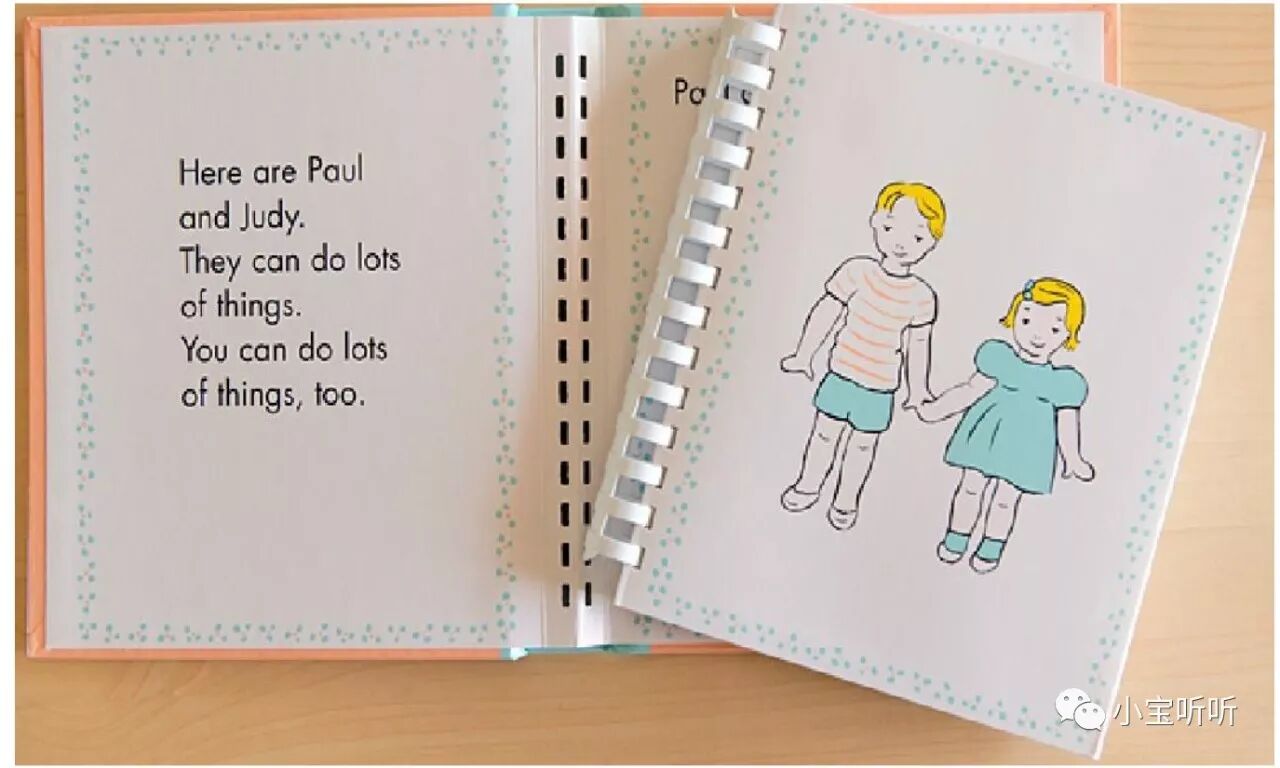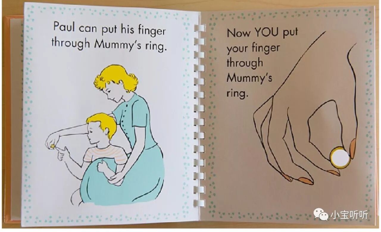 绘本特色:跟普通绘本不同,Pat the Bunny是塑料齿固定页的装订,而且大小更有利于低幼宝宝翻开、平铺,书中的兔子毛、玩peek-a-boo的真布、花散发香味、镜子、爸爸脸上的胡渣、可爱的书中书、还有戒指大小的洞,让宝宝运用多种感官,调动了触觉、嗅觉和视觉,哪个宝宝不喜欢呢?