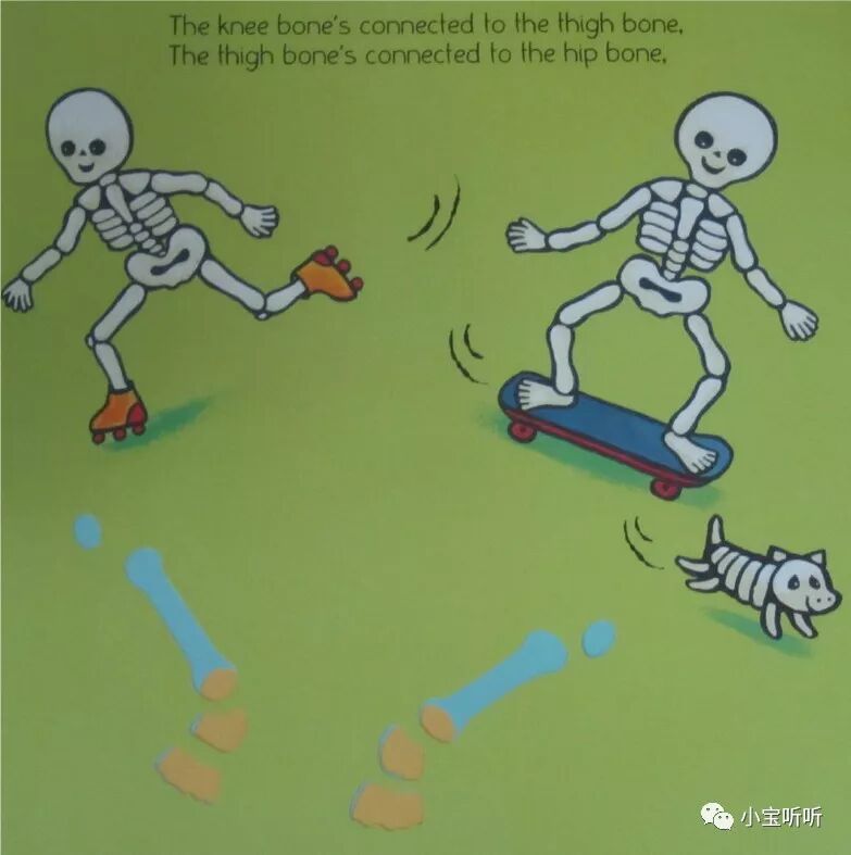 上边页面两个骷髅一个在玩滑轮,一个在玩滑板,身体滑动和扭动时大腿骨(股骨)和臀骨(髋骨)发挥很大作用,因而下边页面这两个部位的骨头跟着露出来了。
