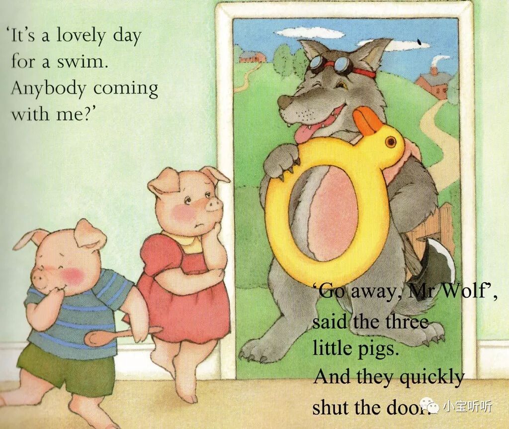三只小猪说:快走开,狼先生。然后他们迅速地关上了门。