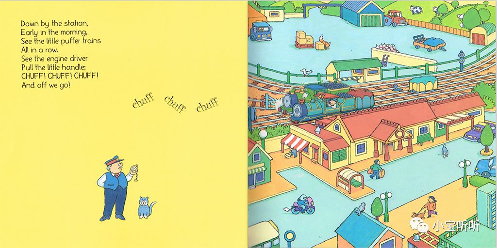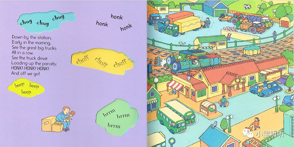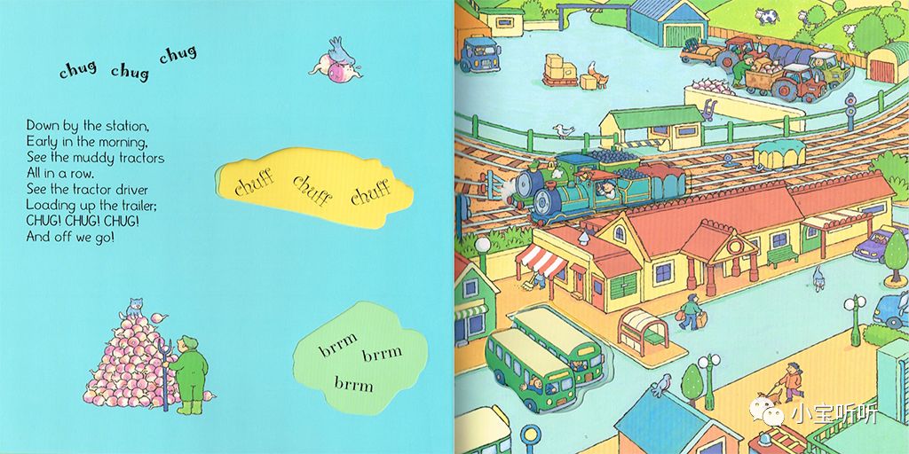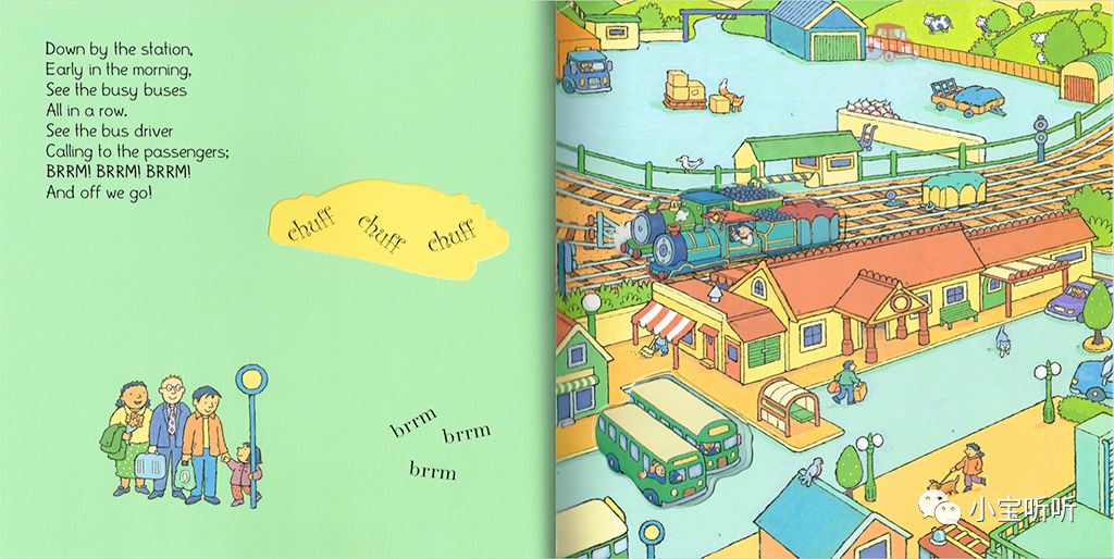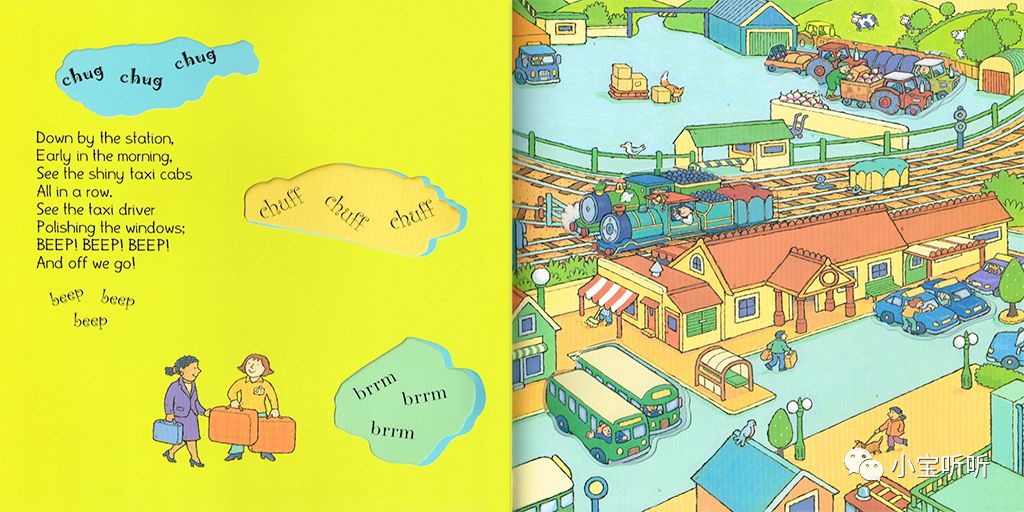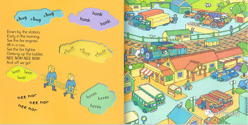 《Down by the station》是一本非常有名的交通工具绘本,歌词朗朗上口,而且它是集各种交通工具于一体,有公交车,火车、大卡车,出租车、消防车,拖拉机等.