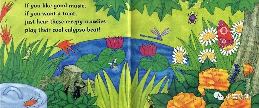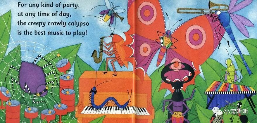 Creepy Crawly Calypso是来自于大名鼎鼎的光脚丫童书社的作品,是一本音乐为主题、关于动物与乐器认知童谣绘本,它不但画风十分鲜艳亮丽,歌曲的旋律也十分轻快优美,朗朗上口。