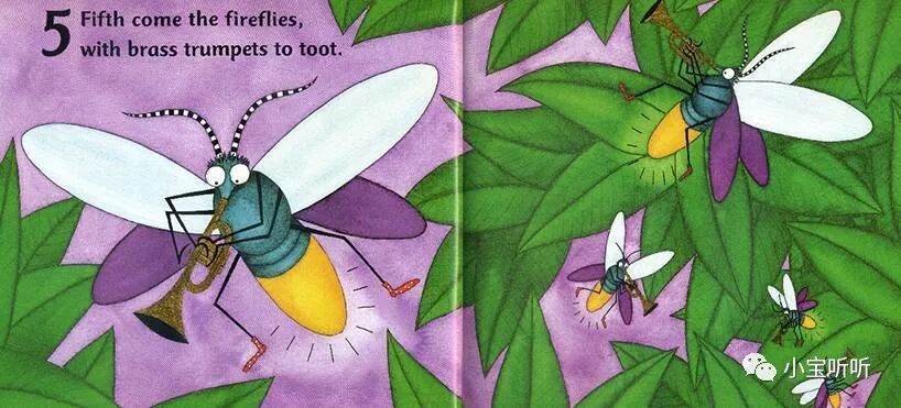 第五个出场的是(五只)萤火虫们,用铜管乐器小号吹啊吹。