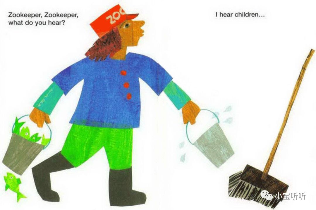 和Brown Bear一样,Polar Bear也是通过一种动物引导出另一种动物,最后引出动物管理员,引出孩子们,孩子们再重现以上各类动物。这种回环结构特别适合编故事。每页的英文都句式短小而朗朗上口,像儿歌一样,方便孩子诵读和自然背记,熟悉“what do you hear”和“I hear something doingin my ear”的句型,形成良好的语感。