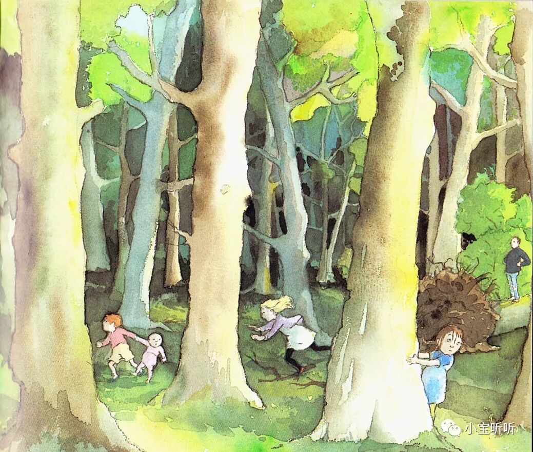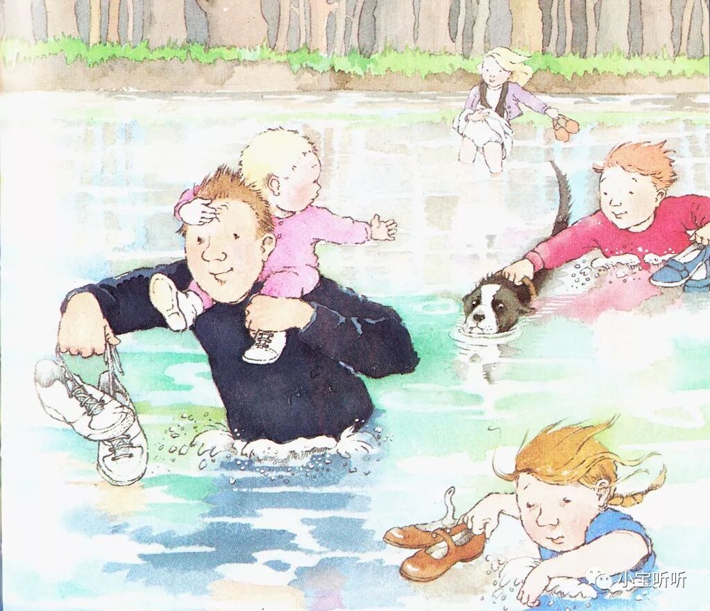一个阳光明媚的日子,爸爸带领着他的四个孩子,一个还在蹒跚学步的婴儿、一个学龄前的男孩儿、两个穿着裙子的漂亮女孩儿,外加一条黑色的牧羊犬,欢呼雀跃般上路了!他们排成长长的一队,又蹦又跳地去捉熊!