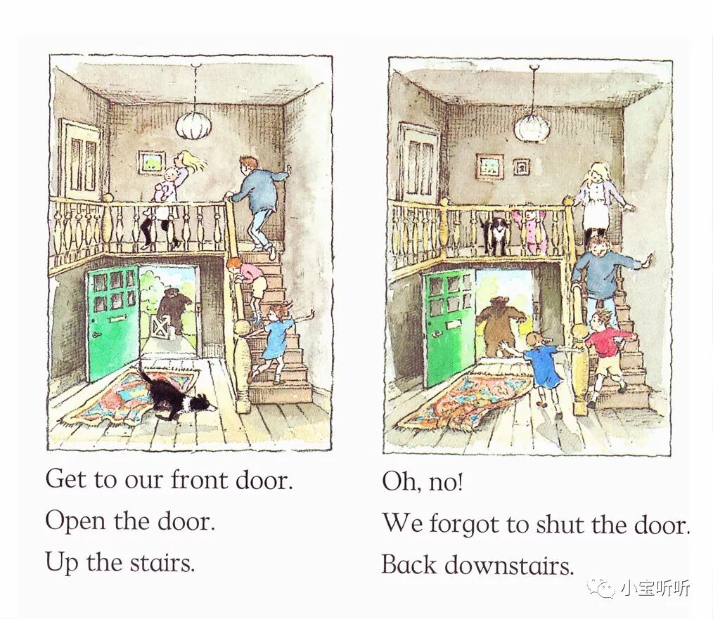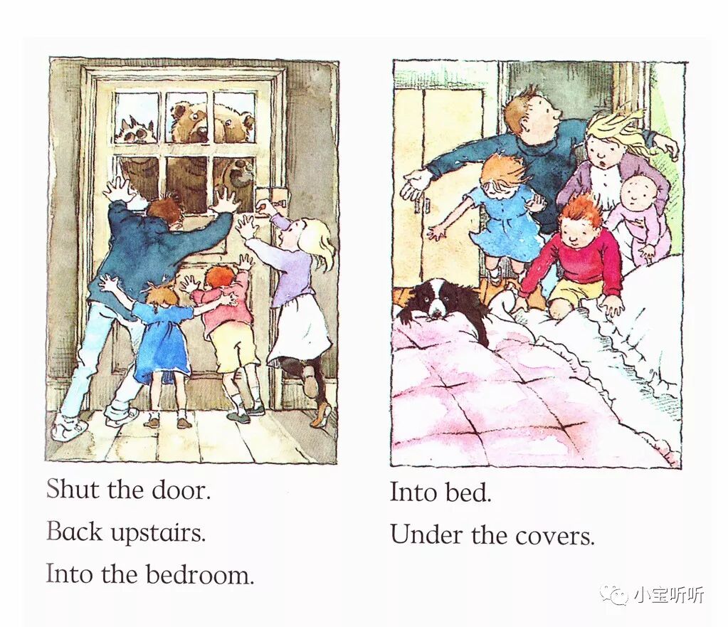 他们经过了高大摇摆的野草、又凉又深的河水、又深又黏的烂泥、好大好深的树林、又急又大的风雪、又窄又暗的山洞,终于在山洞里发现一只狗熊,然而他们一见到巨大的狗熊,马上回头跑回洞口、跑回风雪中、跑回树林里、跑回烂泥地、再跑回野草地,最后打开自家大门,跑进卧房,盖上被子,吓得再也不敢去捉狗熊了。