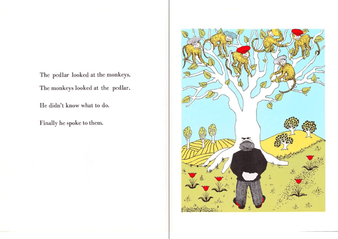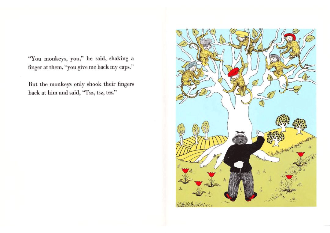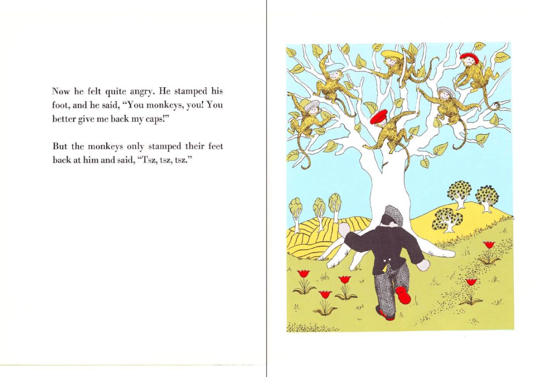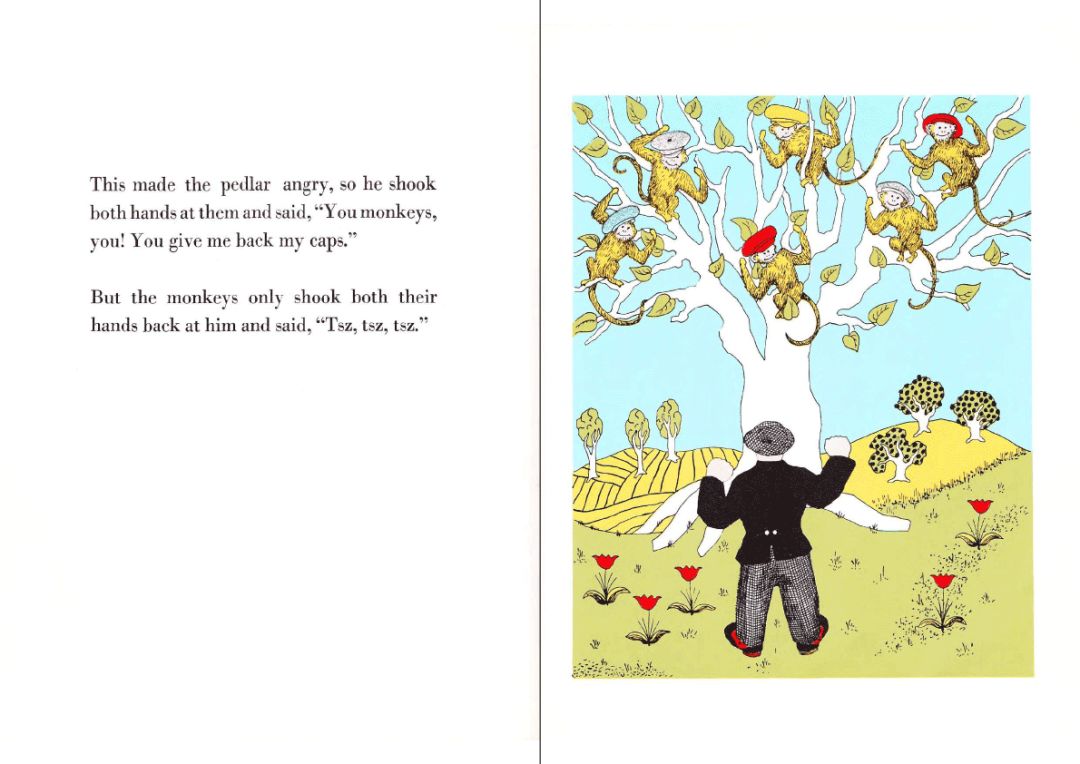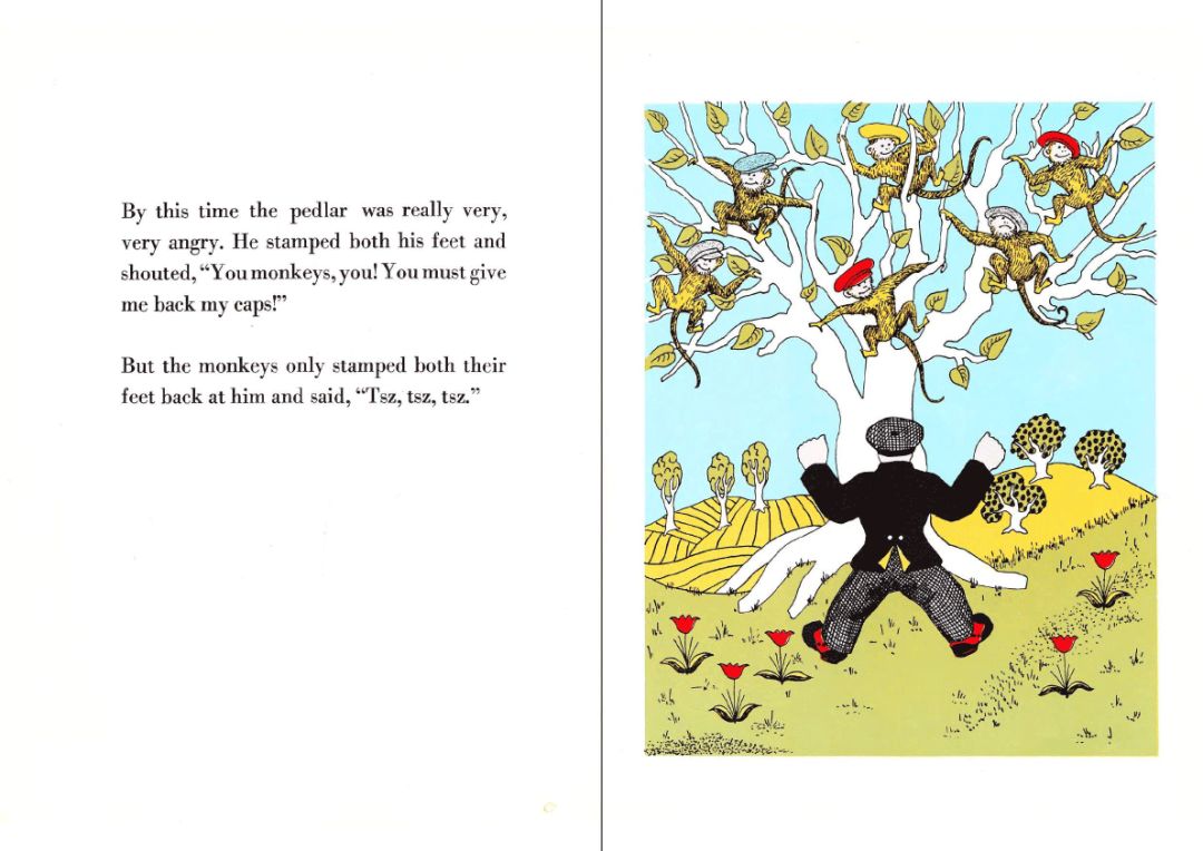 This made the peddler angry, so he shook both hands at them and said, "You monkeys, you! You give me back my caps. "