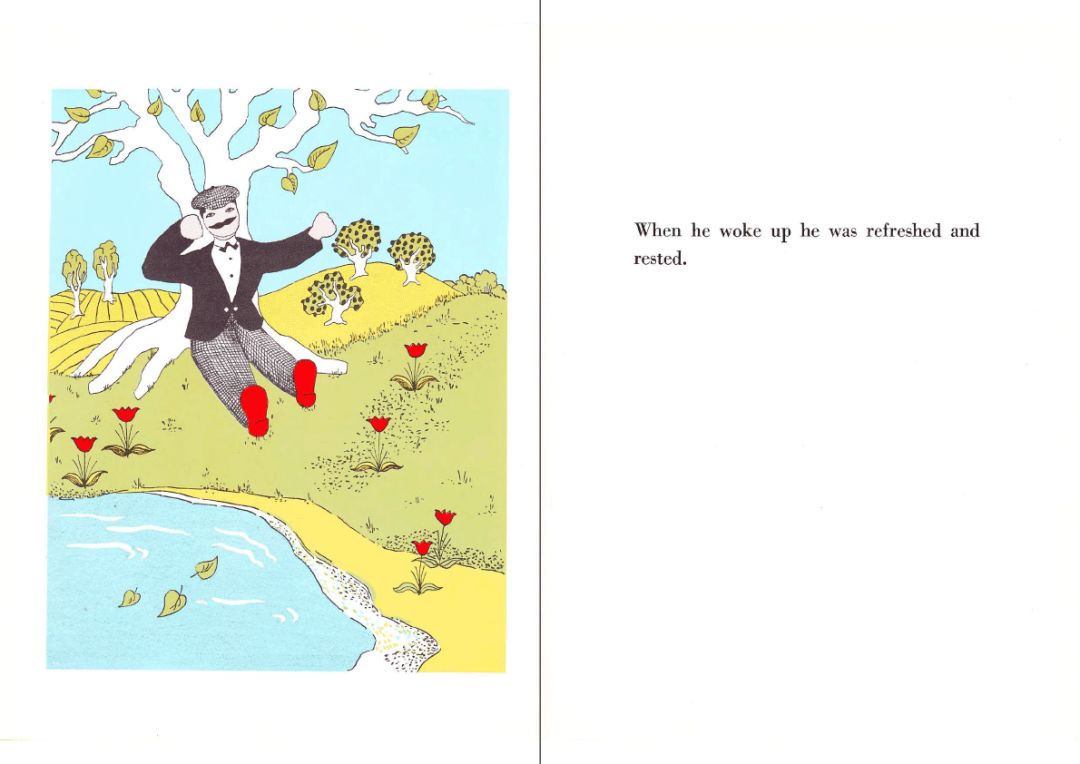 He walked for a long time until he came to a great big tree. That's a nice place for a rest, thought he.