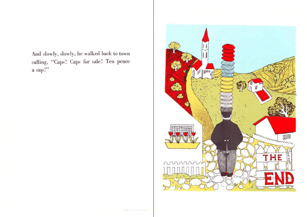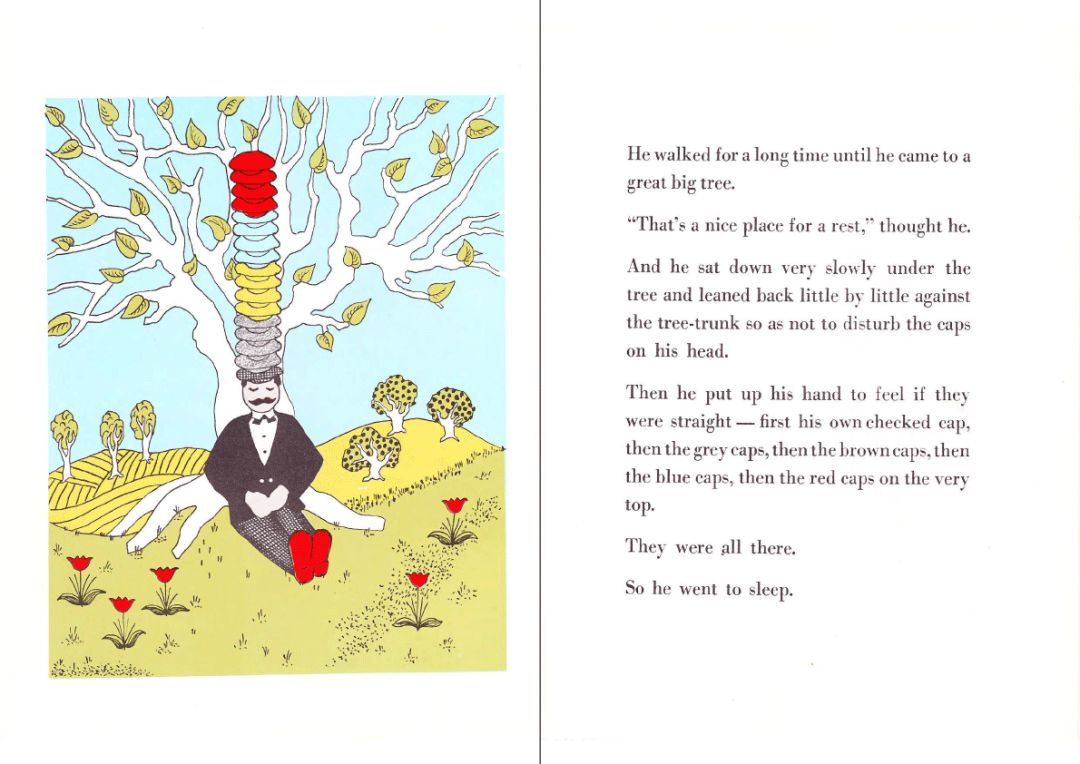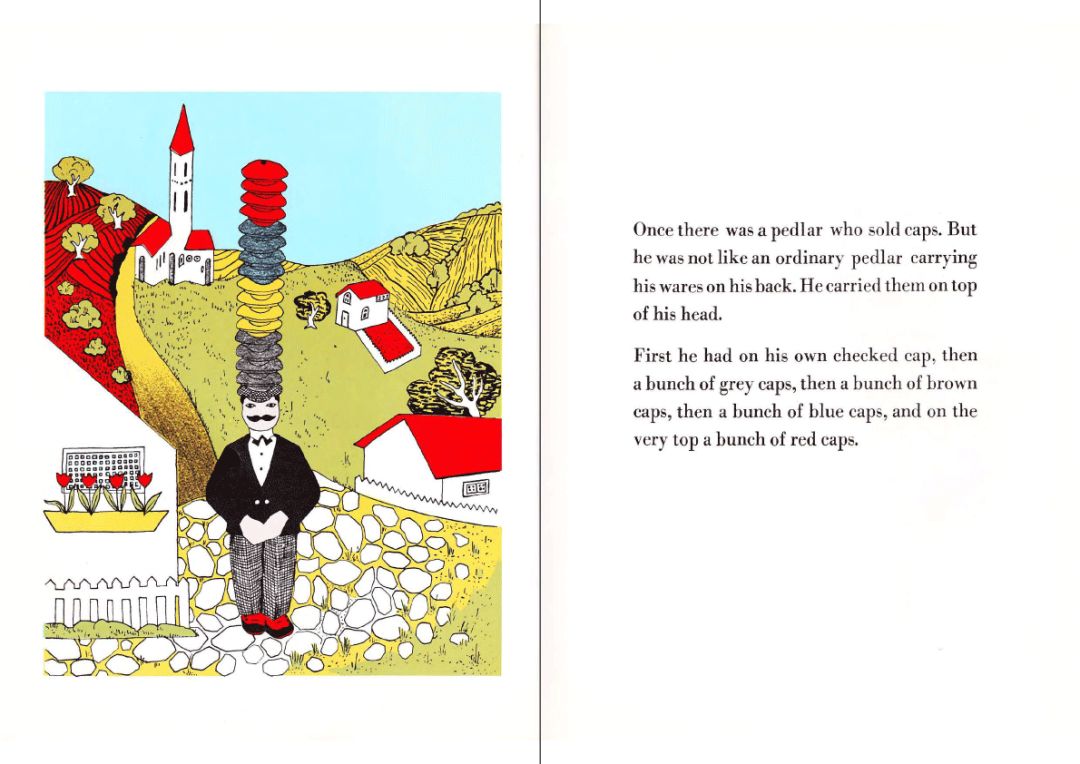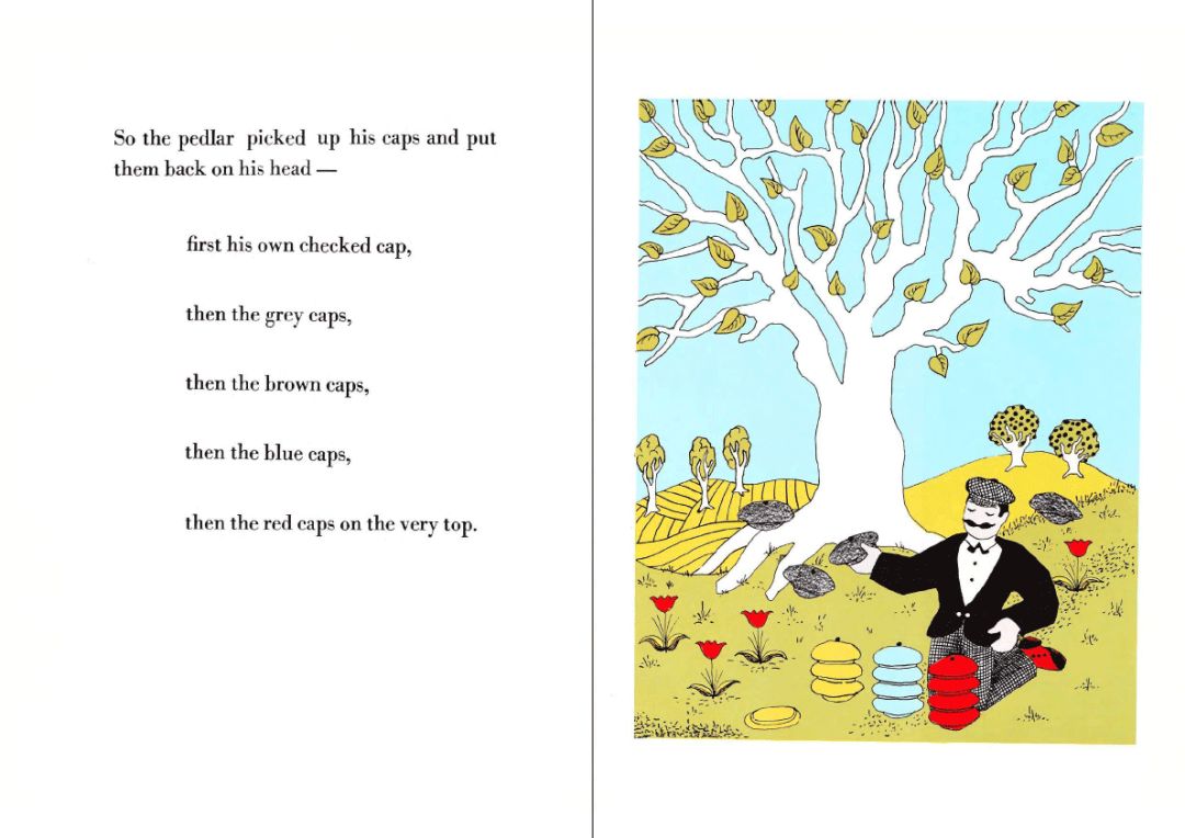 So the peddler picked up his caps and put them back on his head- first his own checked cap, then the gray caps, then the brown caps, then the blue caps, then the red caps on the very top.