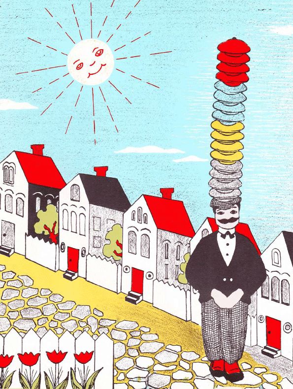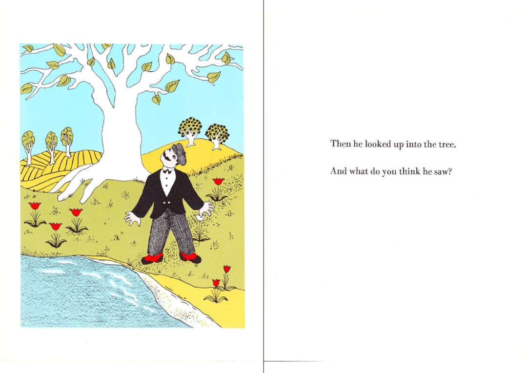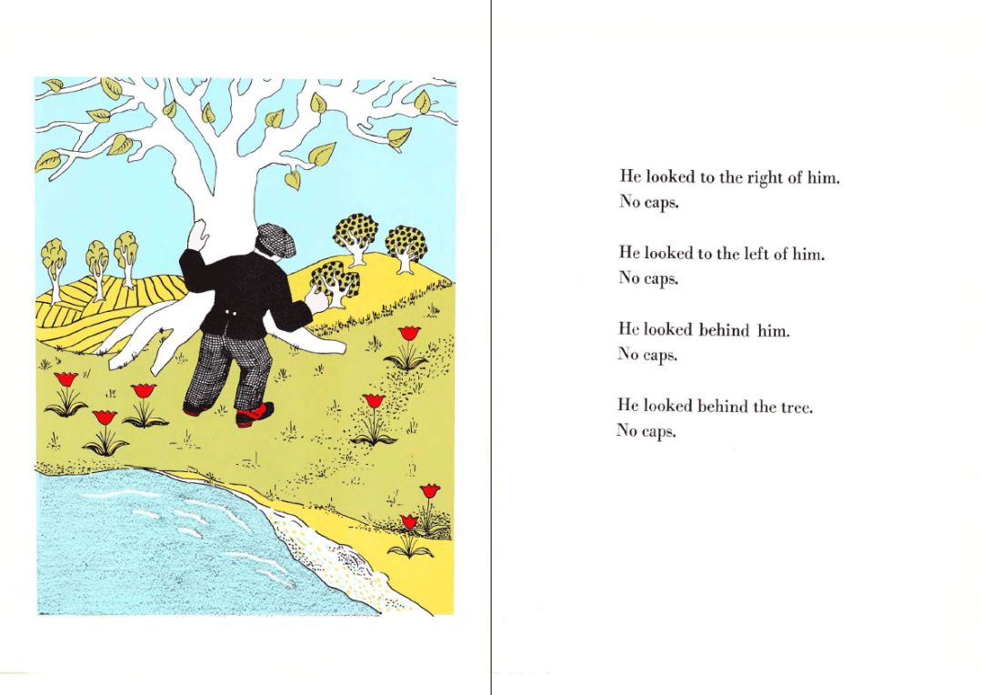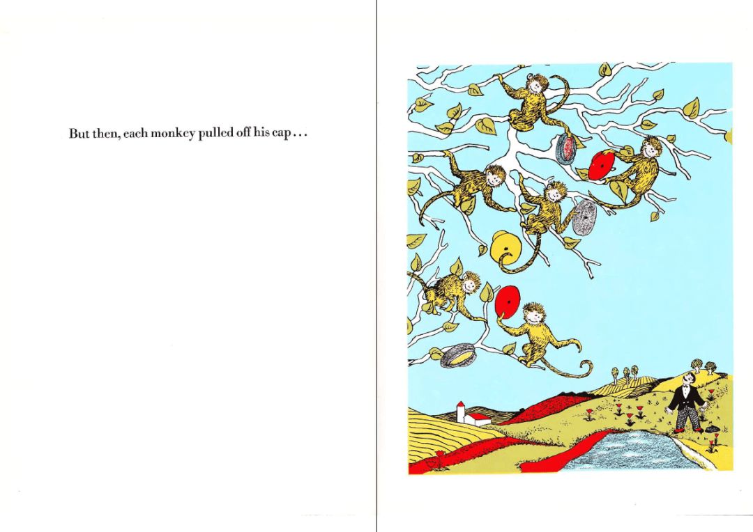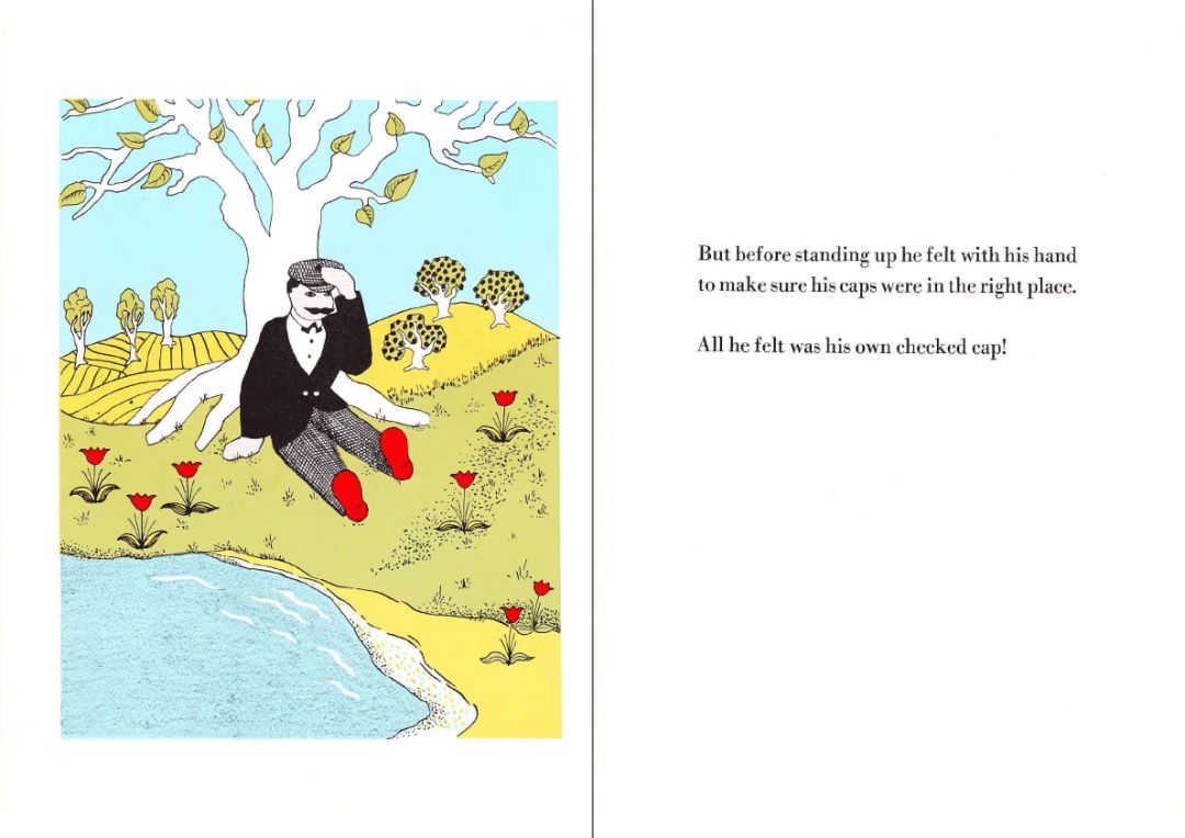 So the peddler picked up his caps and put them back on his head- first his own checked cap, then the gray caps, then the brown caps, then the blue caps, then the red caps on the very top.