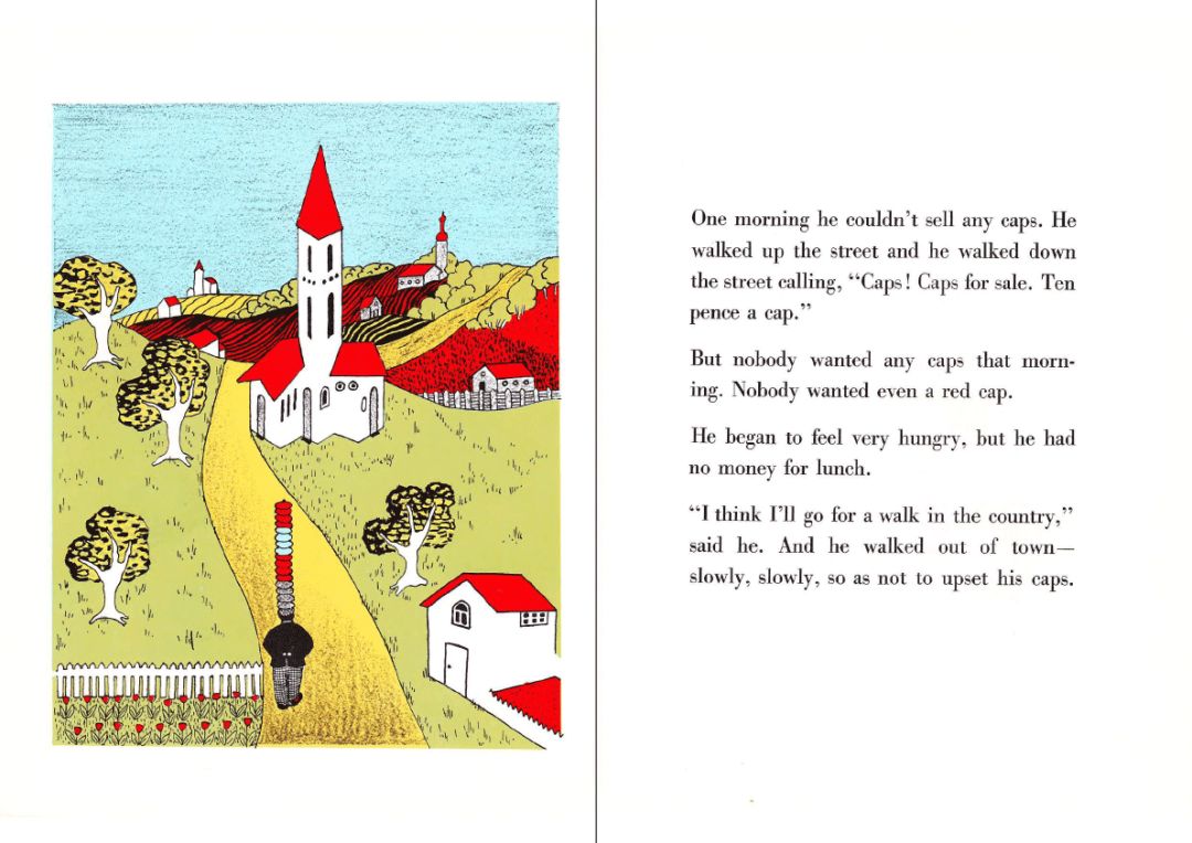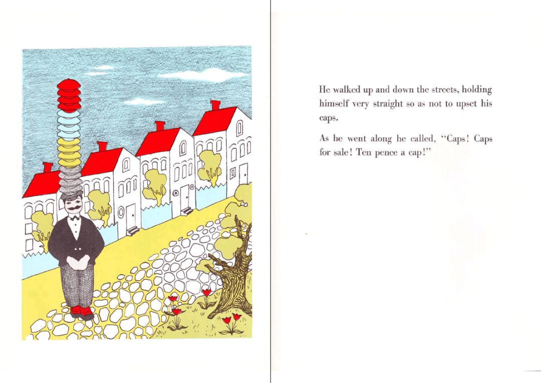 One morning, he couldn't sell any caps. He walked up the street and he walked down the street calling, "Caps! Caps for sale. Fifty cents a cap!"