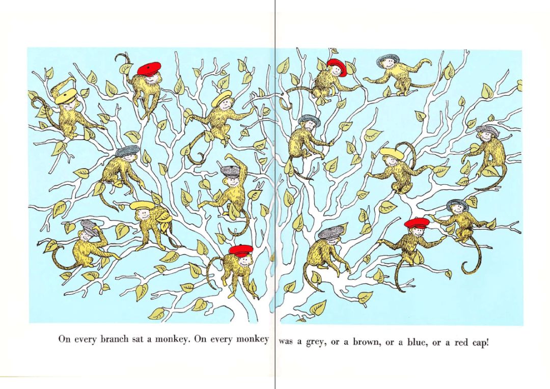 On every monkey was a gray, or a brown, or a blue, or a red cap!