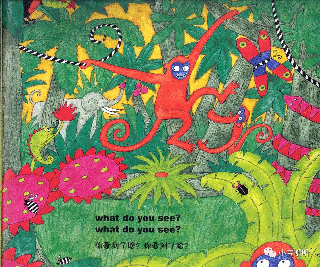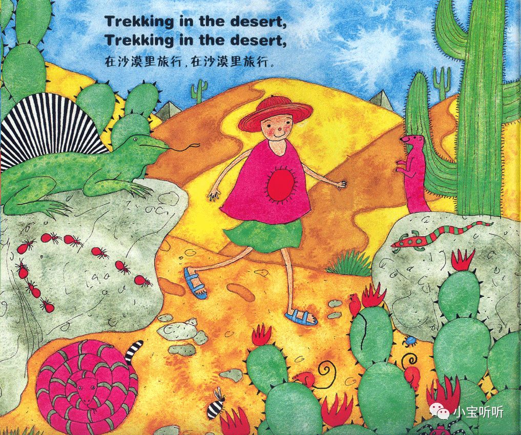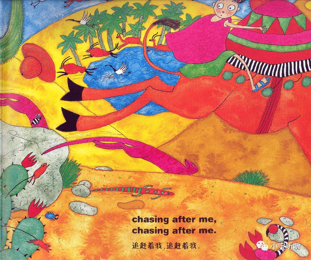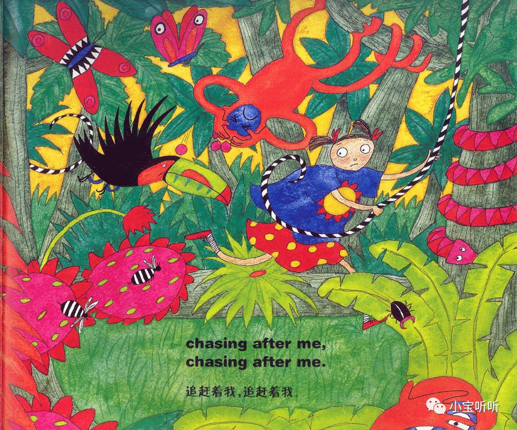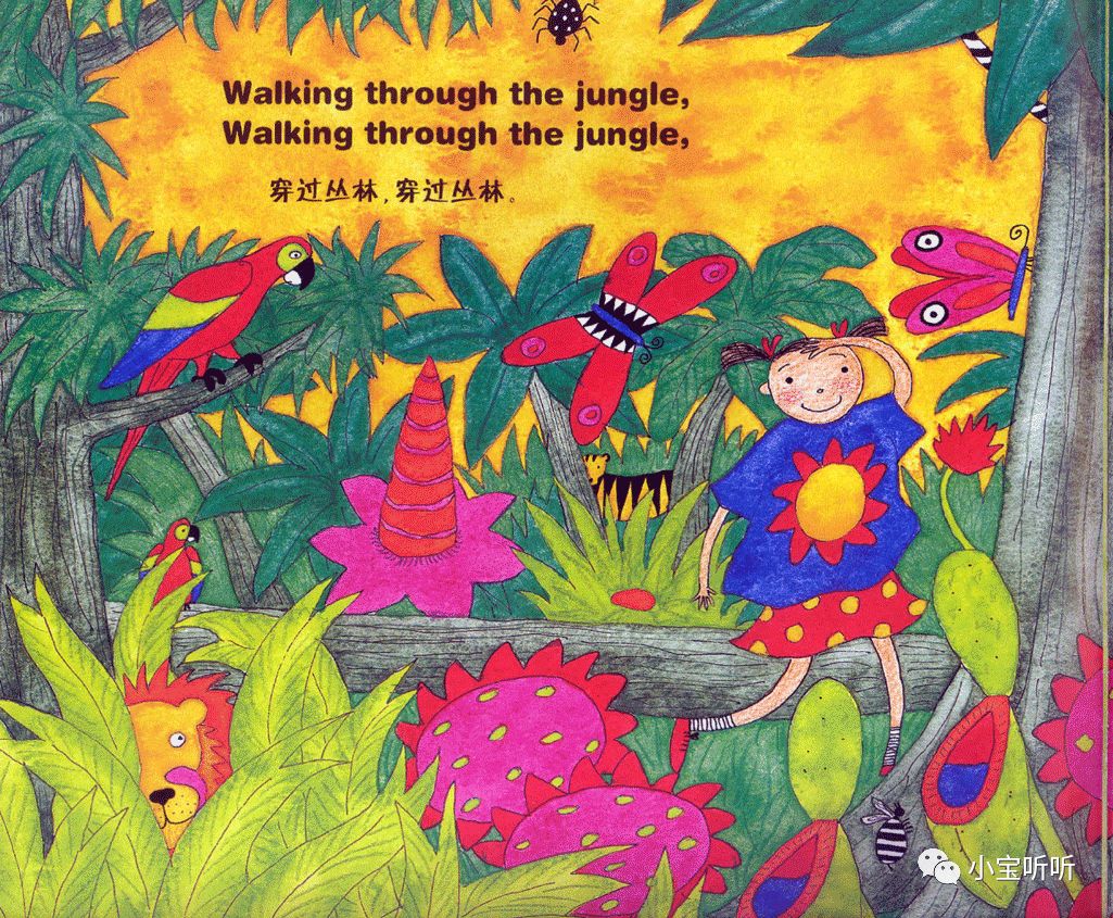 虽然绘本名字叫穿过丛林,但作者的故事情节不仅局限于丛林之中,融大海,山川,河流,沙漠等等为一体,巧妙的为小朋友们呈现出一个五彩缤纷世界。