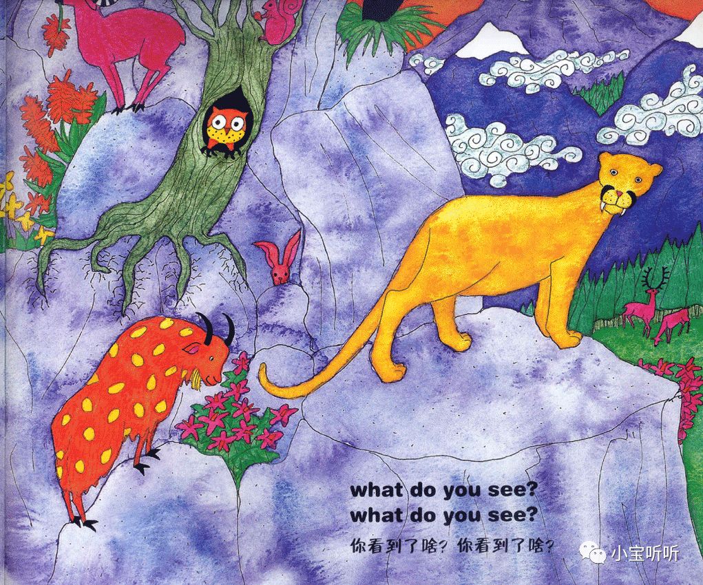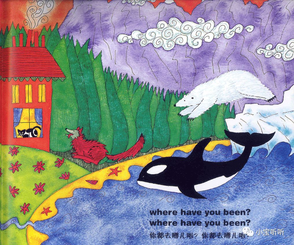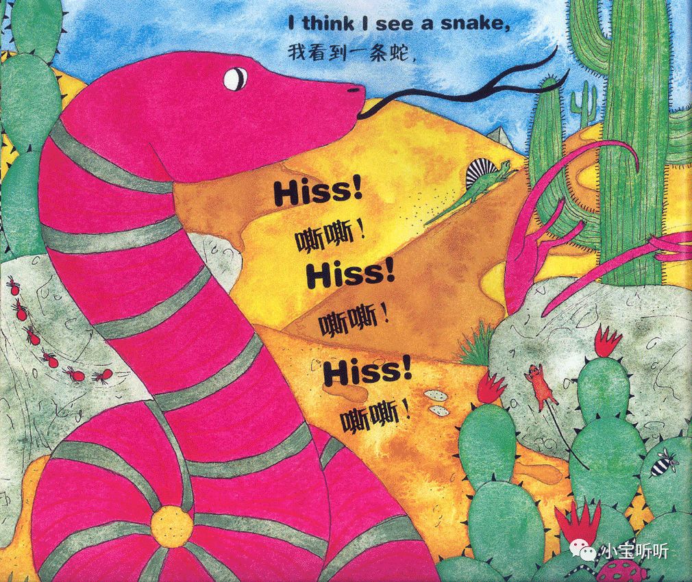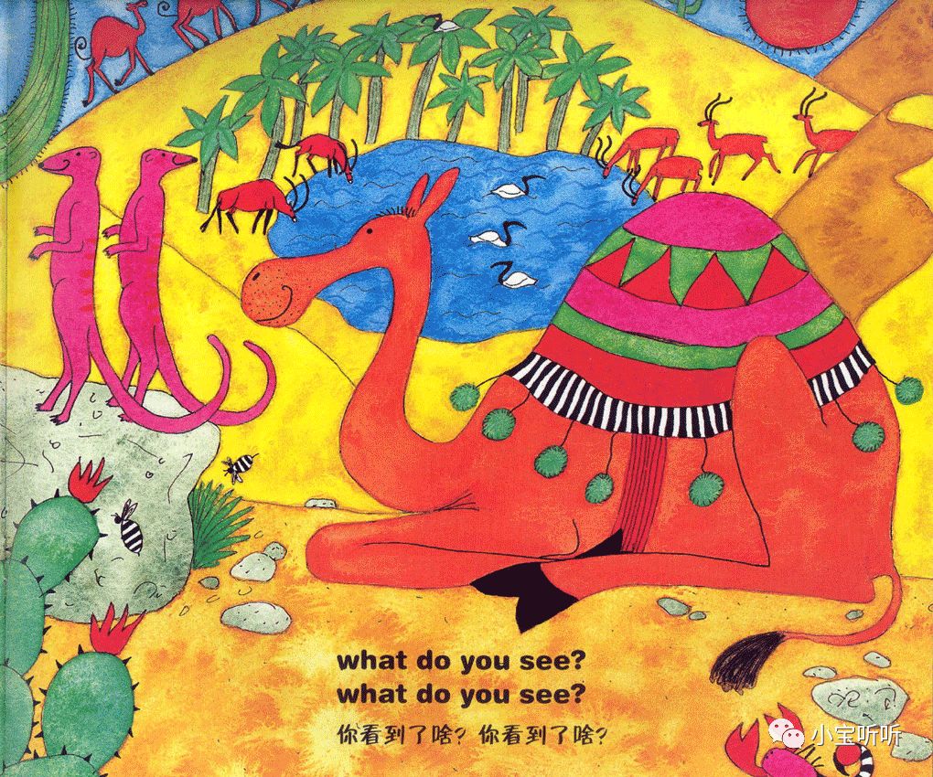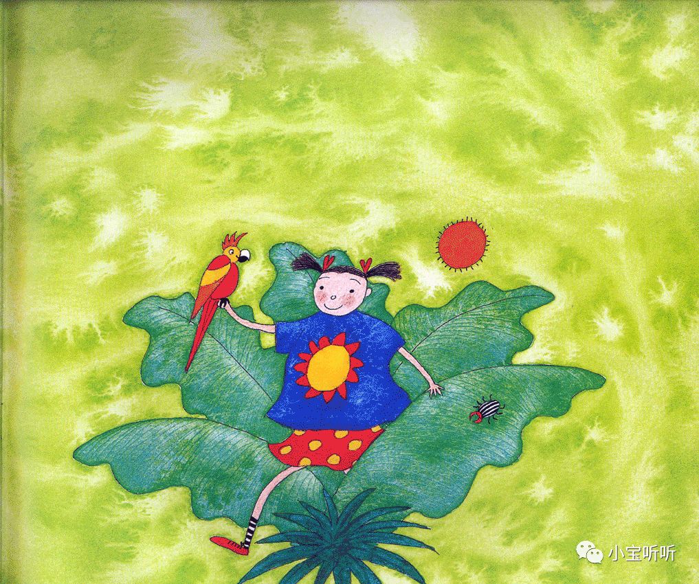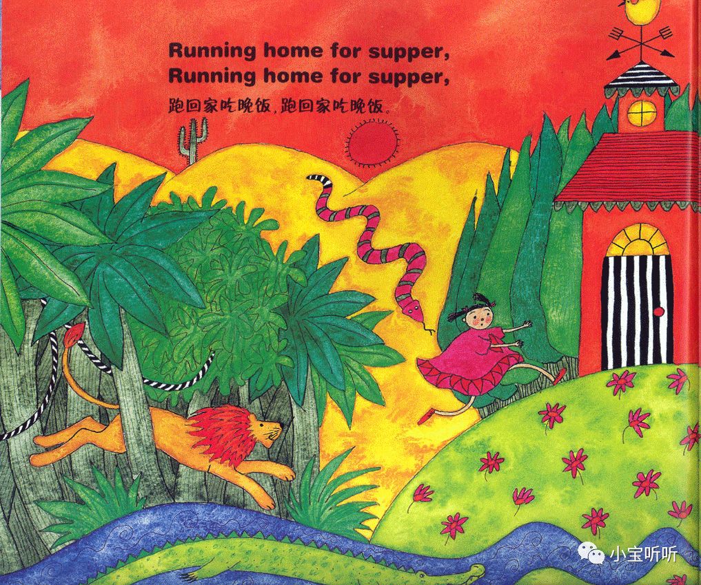 虽然绘本名字叫穿过丛林,但作者的故事情节不仅局限于丛林之中,融大海,山川,河流,沙漠等等为一体,巧妙的为小朋友们呈现出一个五彩缤纷世界。
