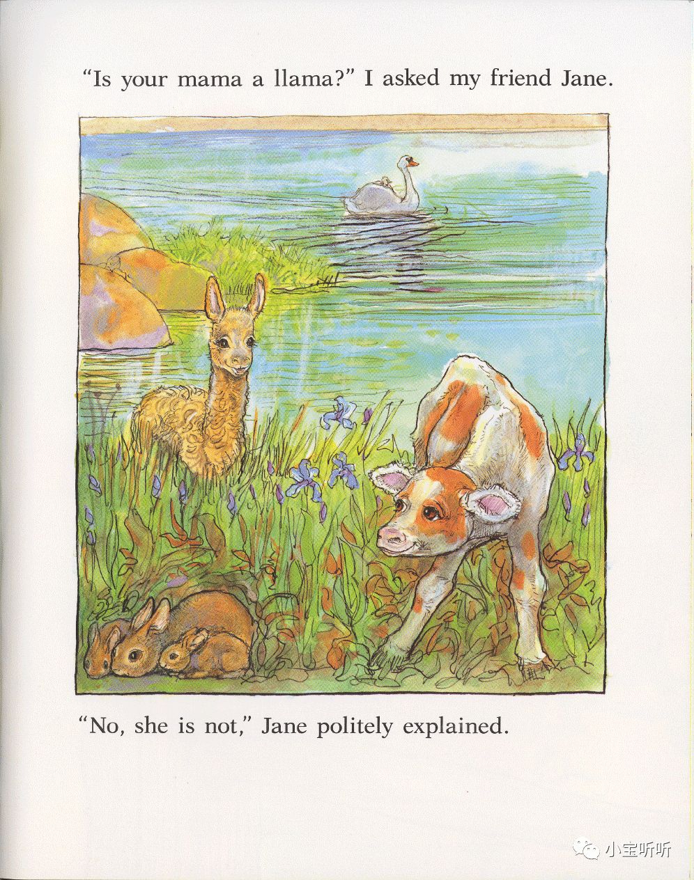 小羊驼Lloyd清早起来,找不见妈妈了。她一个个问自己的朋友“Is Your Mama a Llama?(你的妈妈是羊驼吗)”,朋友们纷纷表示,他们的妈妈不是羊驼。